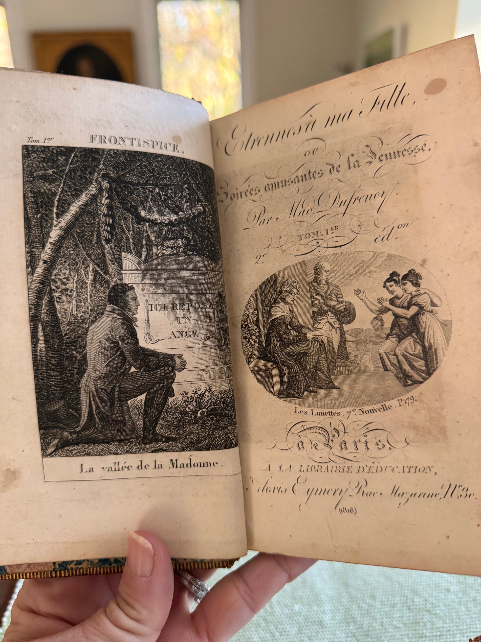 Antique early 19c French 2 volume book set titled, Entrennes A Ma Fille (New Years Gift To My Daughter). Published in Paris 1816. It’s filled with different short stories written in French. There is a bookplate dated 1839 on the front board. Full leather binding with gilt details, marbled endpapers, and gilded fore edges. Illustrated and still contains the original silk bookmarks. Just a sweet set! There is some wear to the leather and boards. Volume 2 has a crack in the front bottom board (about an inch) but it is still holding strong. A very good early 1800s set!