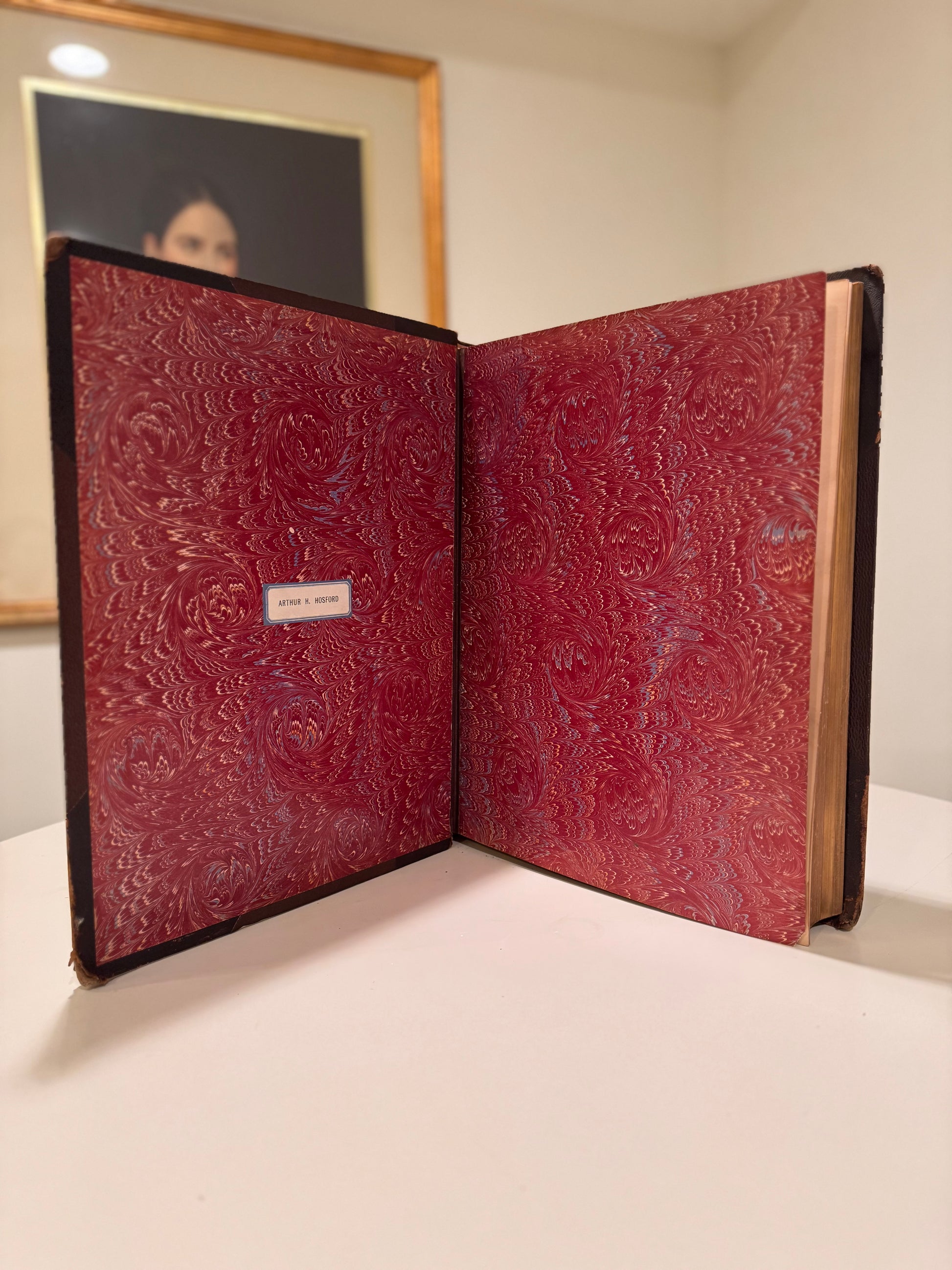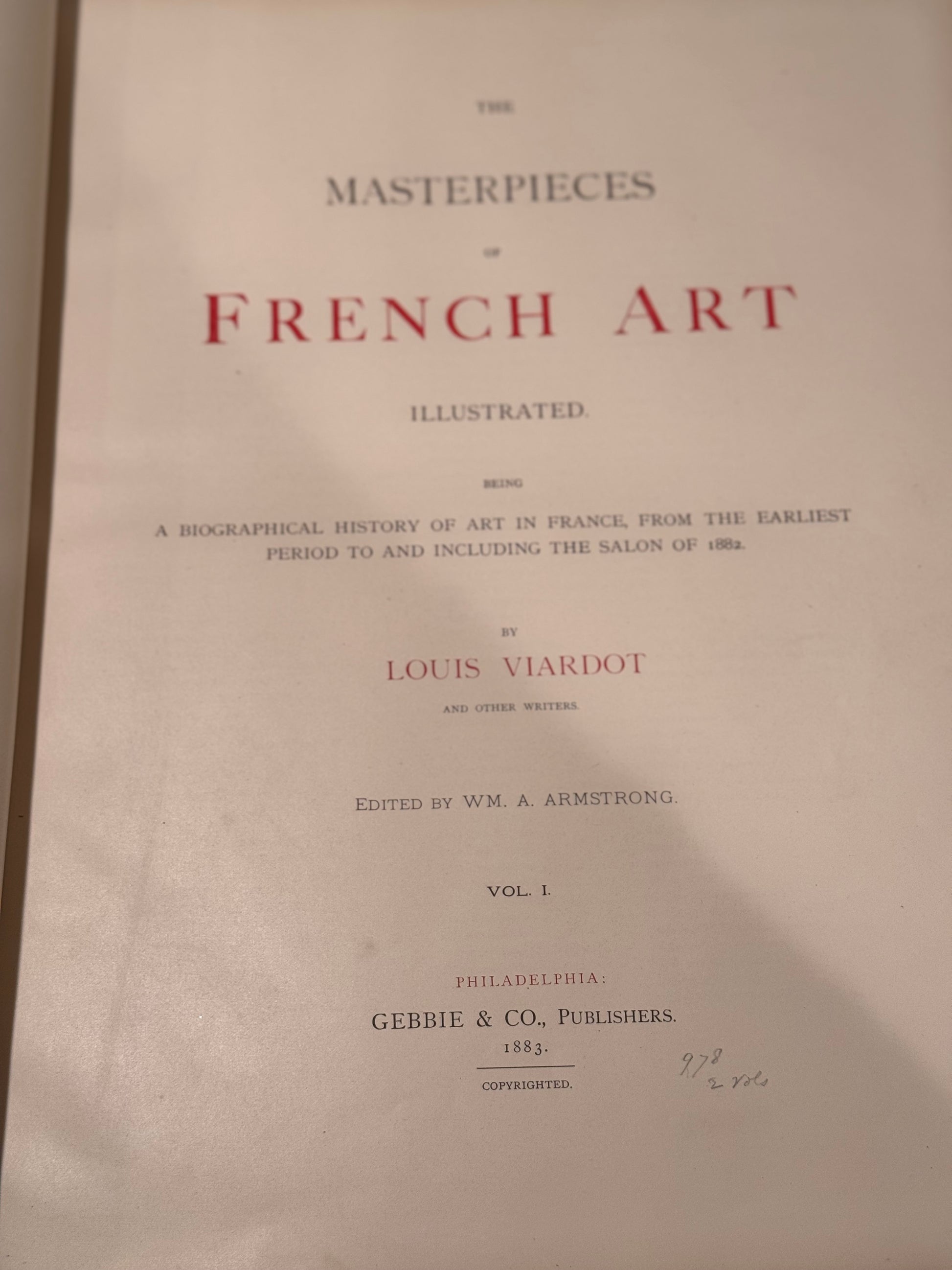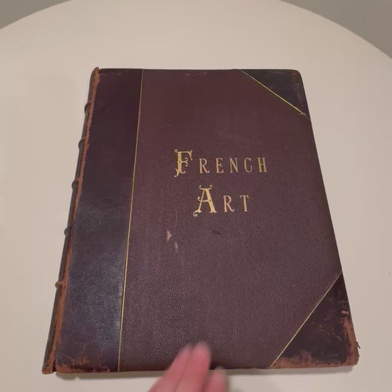 Antique 19c The Masterpieces of French Art Volume 1 by Louis Viardot & other writers. Published in 1883, Gebbie & Co. Philadelphia and edited by William A. Armstrong. Written in English. This book is a stunner! A fantastic coffee table piece filled with 100 illustrations of famous French paintings (50 photogravures & 50 wood engravings). Leather binding with gilt lettering, gilt fore edges, marbled endpapers, and highly illustrated. The binding is super solid, no loose or missing pages, and barely any foxing. Disclaimers: wear to the corner and spine leather, minor cracking to spine but otherwise solid, and some wear marks to front and back boards. A previous owners label is on the back of the front board, Arthur H. Hosford. A very fine condition book! One of the best condition volumes I’ve come across.
