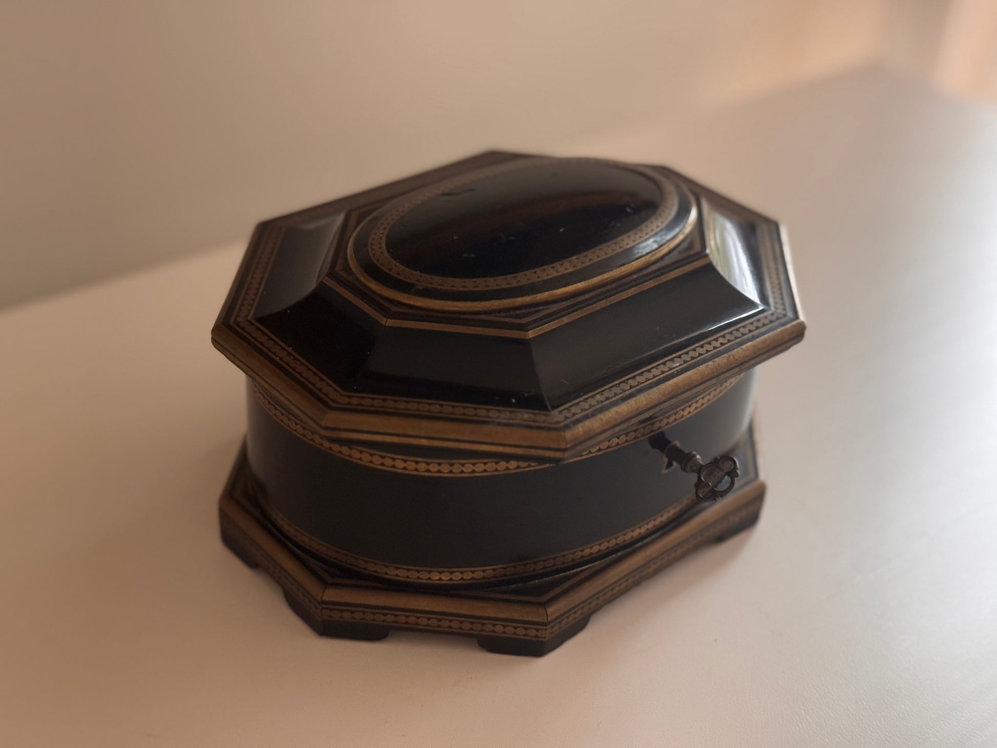 Antique 19c French Tahan Signed Blackened Wood & Brass Jewelry Box With Key