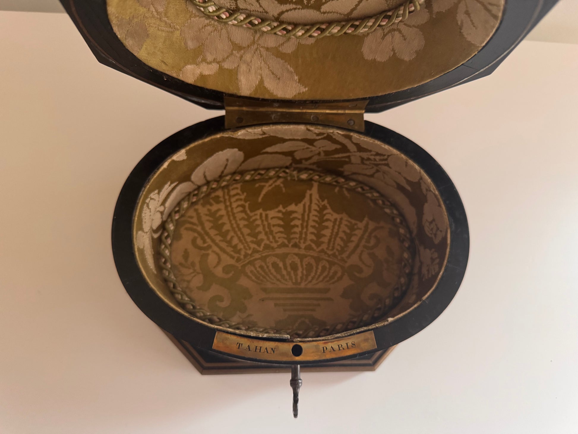 Antique 19c (1840-1890) French blackened jewelry box, signed Tahan Paris. This is such a fabulously sweet box! Working original key, lovely interior fabric is in almost perfect condition, brass marquetry and inlay. There are some minor marks to the top but you can barely notice them and they don’t quite show up in pictures. Just thought I’d mention. Closes tightly and very clean. The edges and decorative elements are NOT painted on. That is actually brass detailing. Amazing!!
