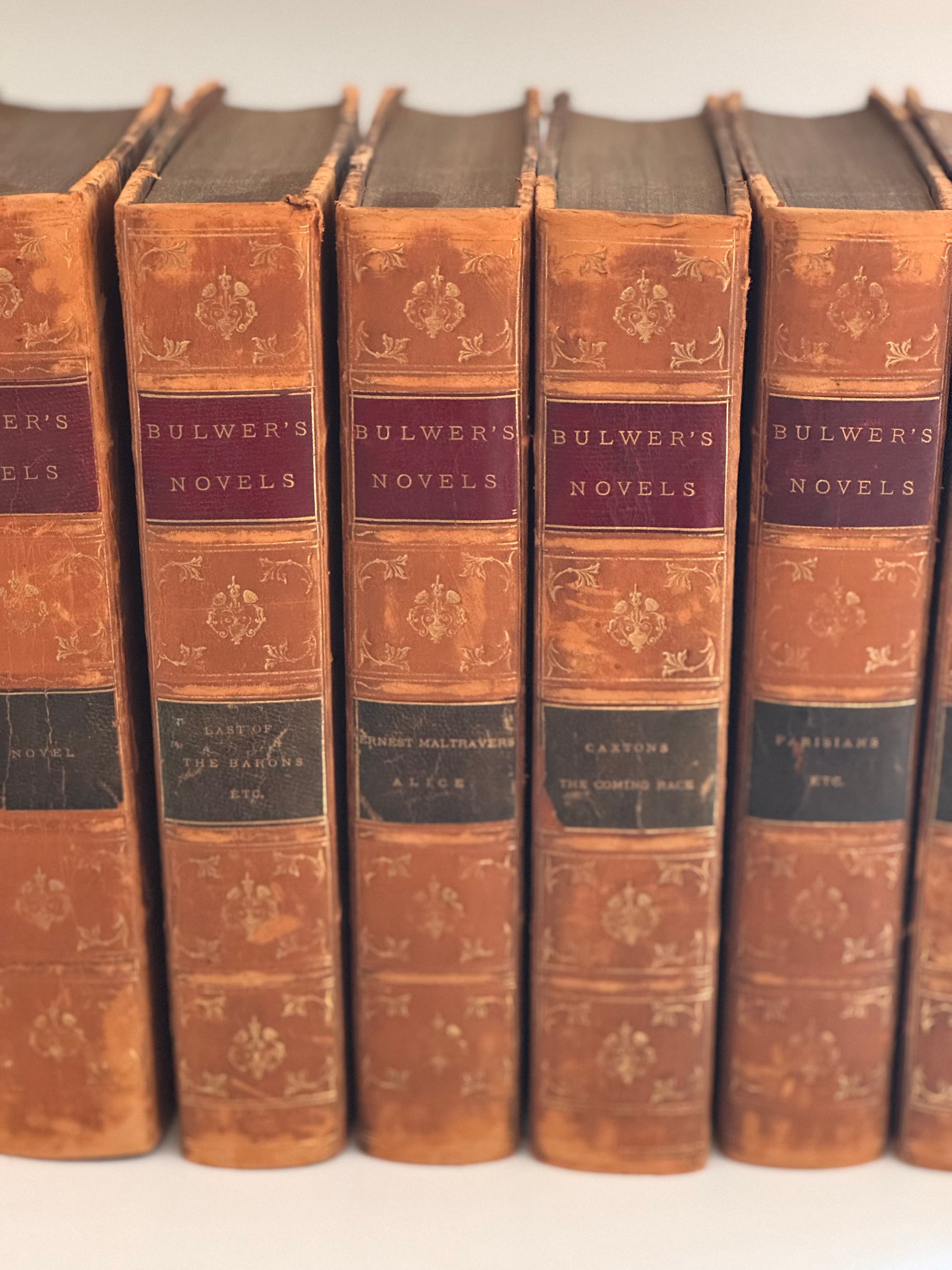 Antique 19c Set of 7 Bulwer’s Novels Circa 1882 Half Leather Marbled Last Days of Pompeii Etc