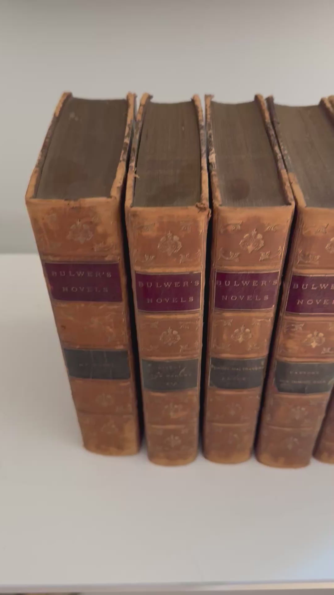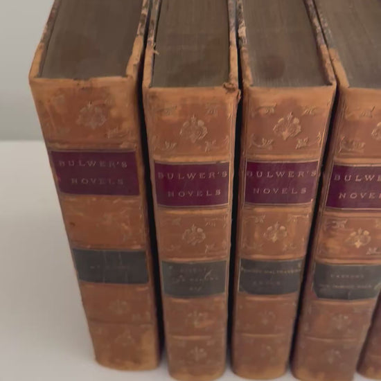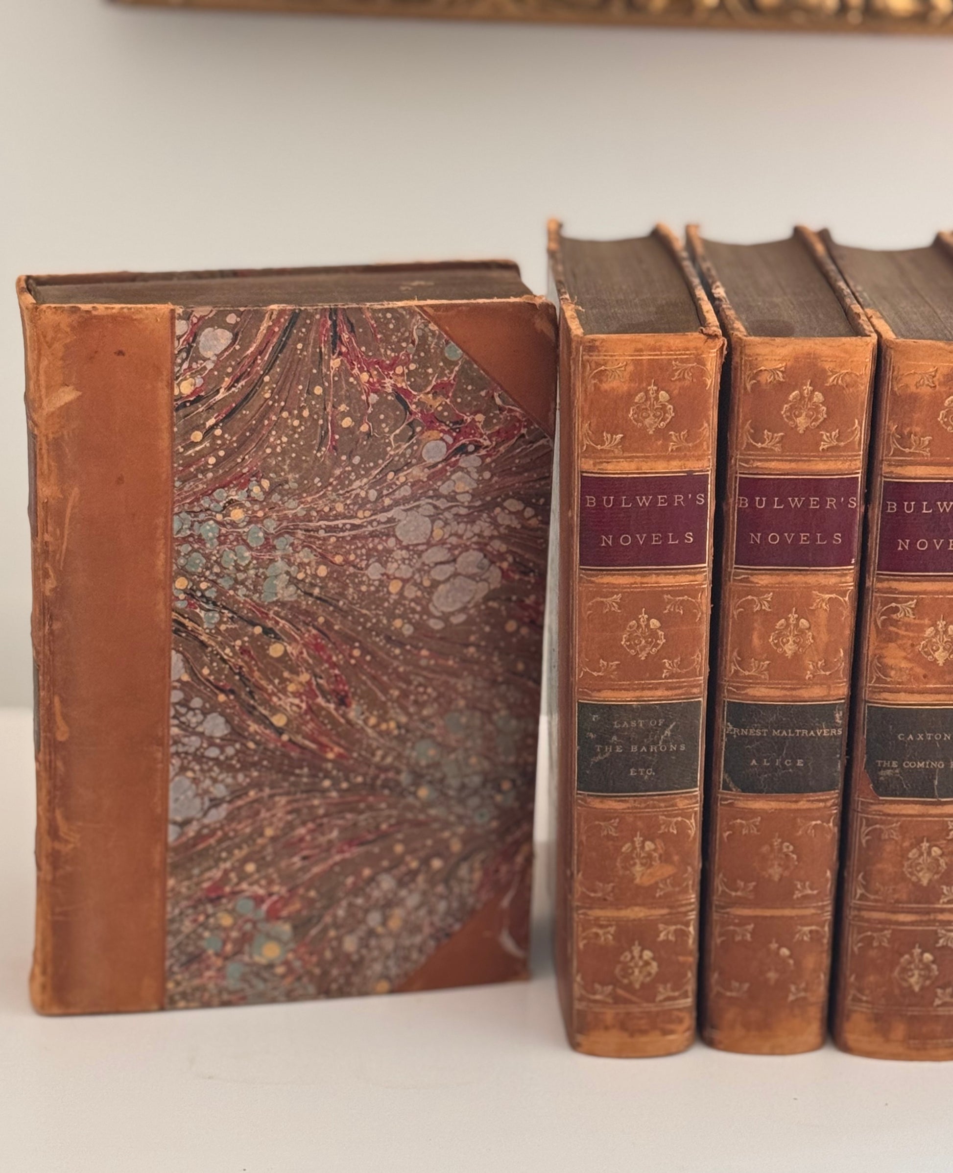 Beautiful set of 7 Bulwer’s Novels. Half leather binding with marbled covers and endpapers. Gilt top fore edge and lovely gilded floral details on spine. All bindings are tight with no cracks or splitting. There is bumping and some wear to the corners and some marks and wear to the leather spines. Otherwise a very good set!