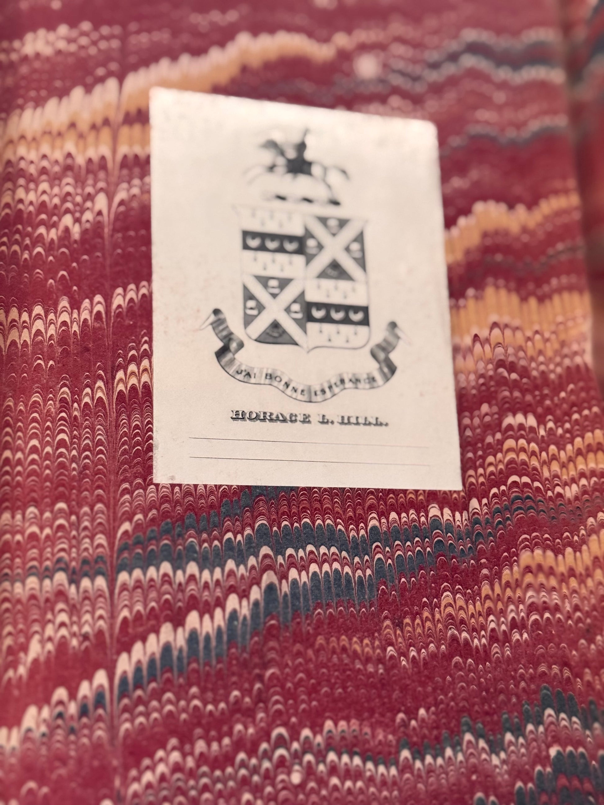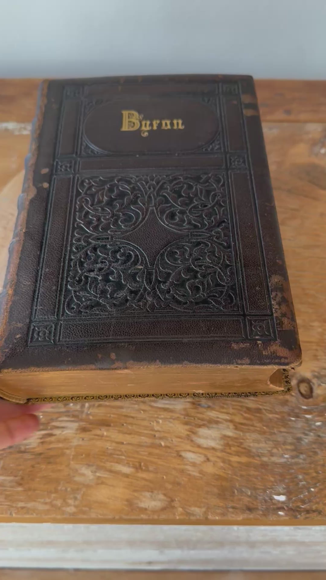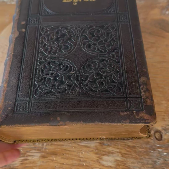 Antique 19c copy of The Complete Poetical Works of Lord Byron, published New York 1865. Full tooled leather book with gilded fore edges and raised banded decorative spine. Gilded Byron and tooling on both front and back covers. Illustrations throughout and an ex Libris and inscription for Horace Hill dated 1866. The binding is tight but there is cracking to the hinge so you’ll need to take care and never open it to 90 degrees! Some bumping and leather loss to corners and mild discoloration to interior pages but nothing major. Overall a fine copy! Hefty book weighing in at about 2lbs.