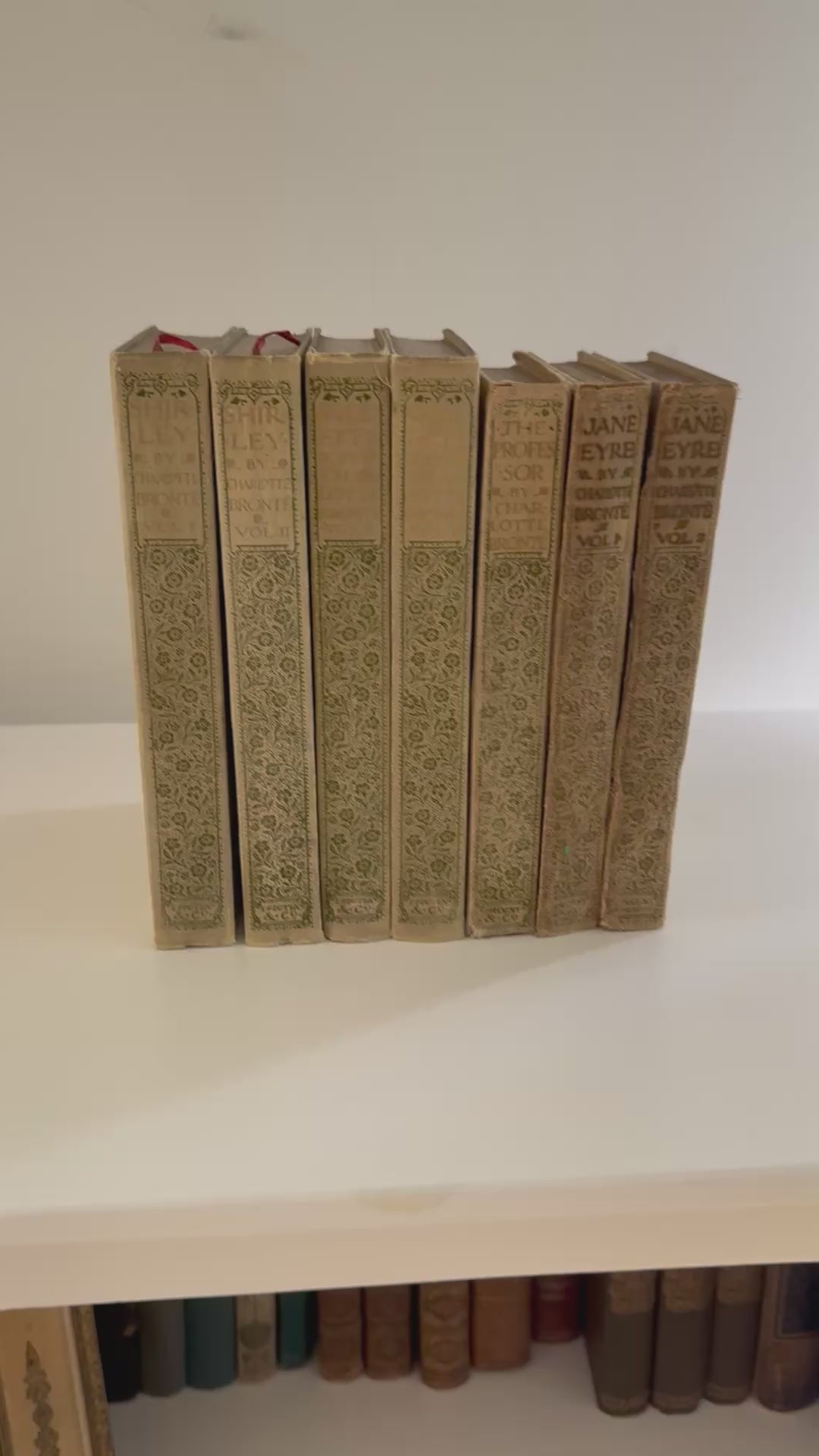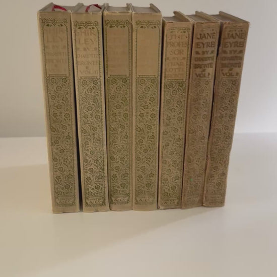 Antique early 1900s partial set of Charlotte Bronte’s works. This was originally a 10 volume set. Volumes present include Jane Eyre, The Professor, Shirley, and Villette. Published by JM Dent, London 1905 and illustrated by Edmund Dulac. Shirley, Villette, and The Professor are all in similar condition. Minor age darkening to spines and slight fraying to fabric on top and bottom spine edges. Minor bumping to board corners. Jane Eyre has cracks and separation to fabric on spines but the binding is tight with no loose pages. Age darkening and wear to spine and boards and mild foxing to interior pages.