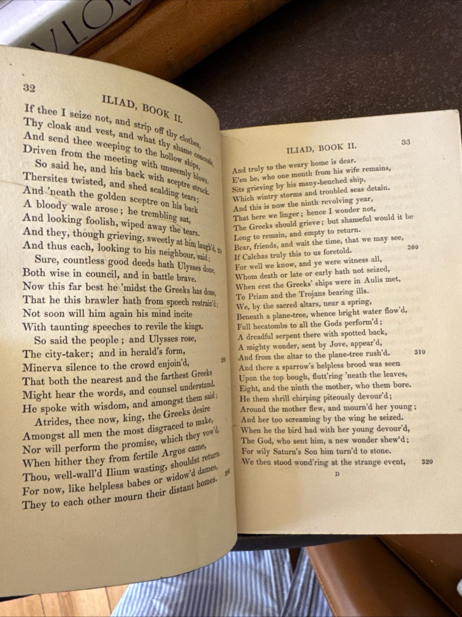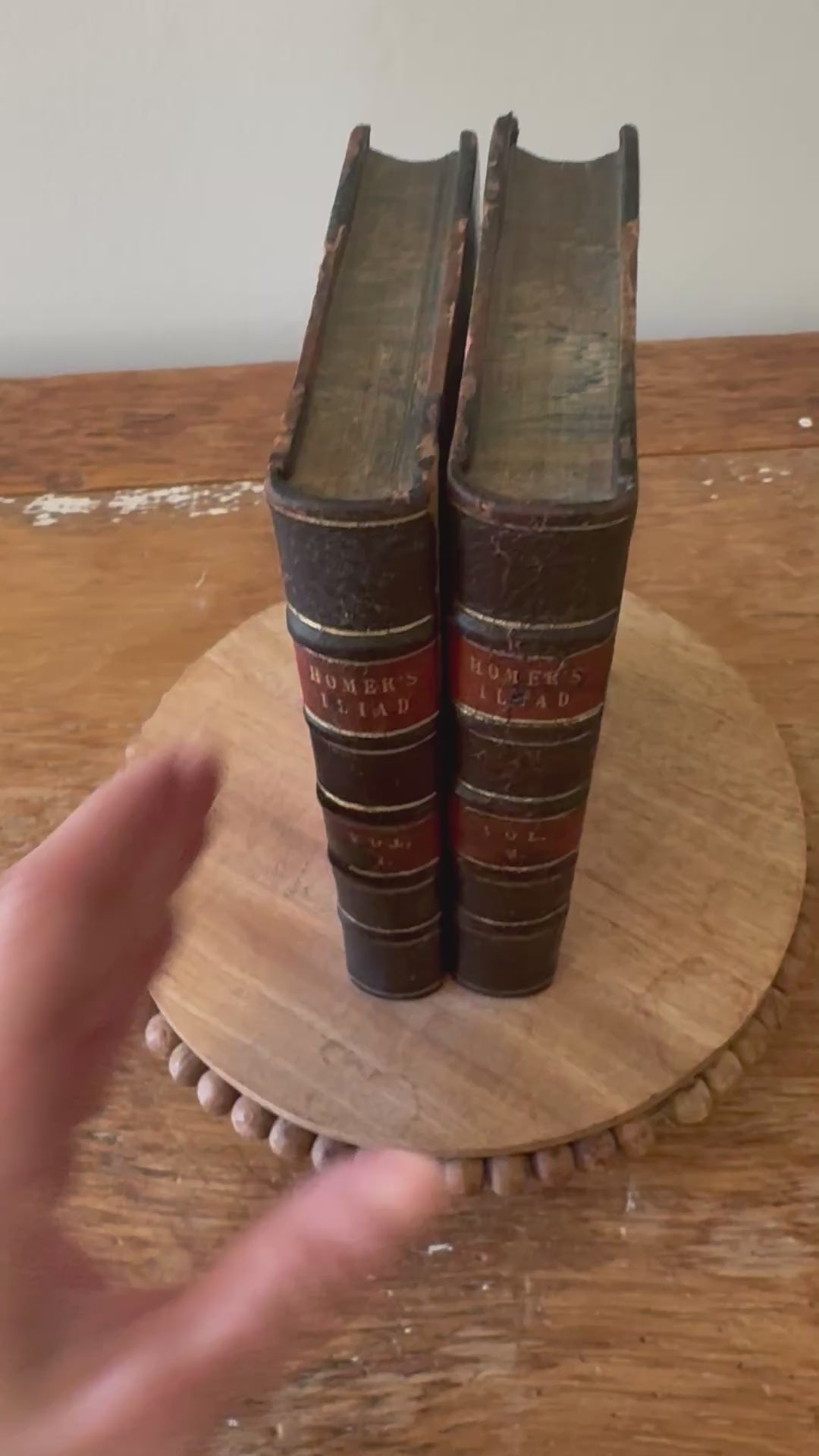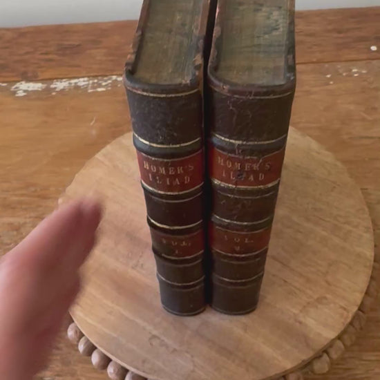 Antique early 19c century full two volume set of Homer’s The Iliad. Fantastic quarter black leather and marbled fine bindings. The binding is tight with no loose pages. Marbled fore edges with raised banded spines. Pages are clean and bright. There is some wear to the leather and the hinges have started to crack but there is no separation. Overall in very good condition.