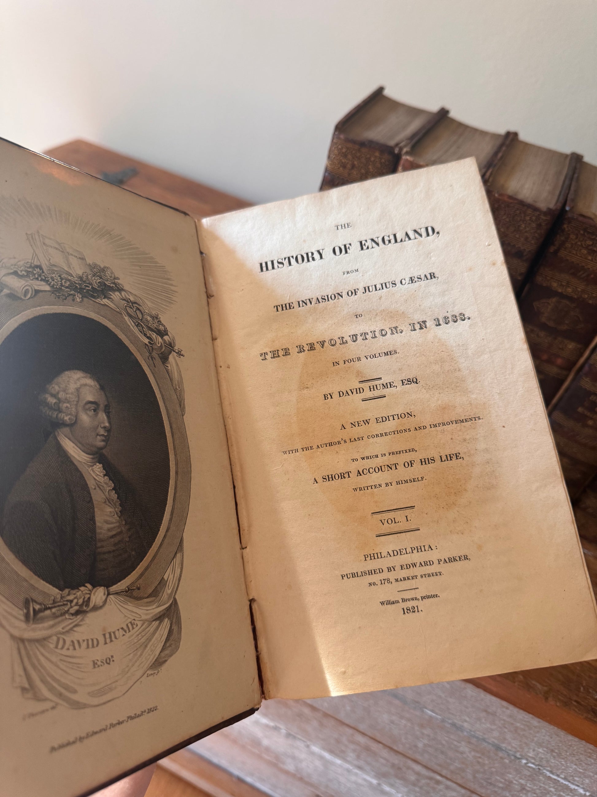 Antique early 19c nine volume full leather set of History of England. Published by William Brown, Philadelphia 1821 & 1822. They cover the invasion of Julius Caesar through the reign of George III. All the bindings are tight and the gilded spines look fabulous on a shelf. There is wear to the leather, corners bumped, most boards have cracked and been glued but all are intact and holding on tight with no separation. Pages are moderately foxed and darkened. Overall an attractive set for 200+ years old!