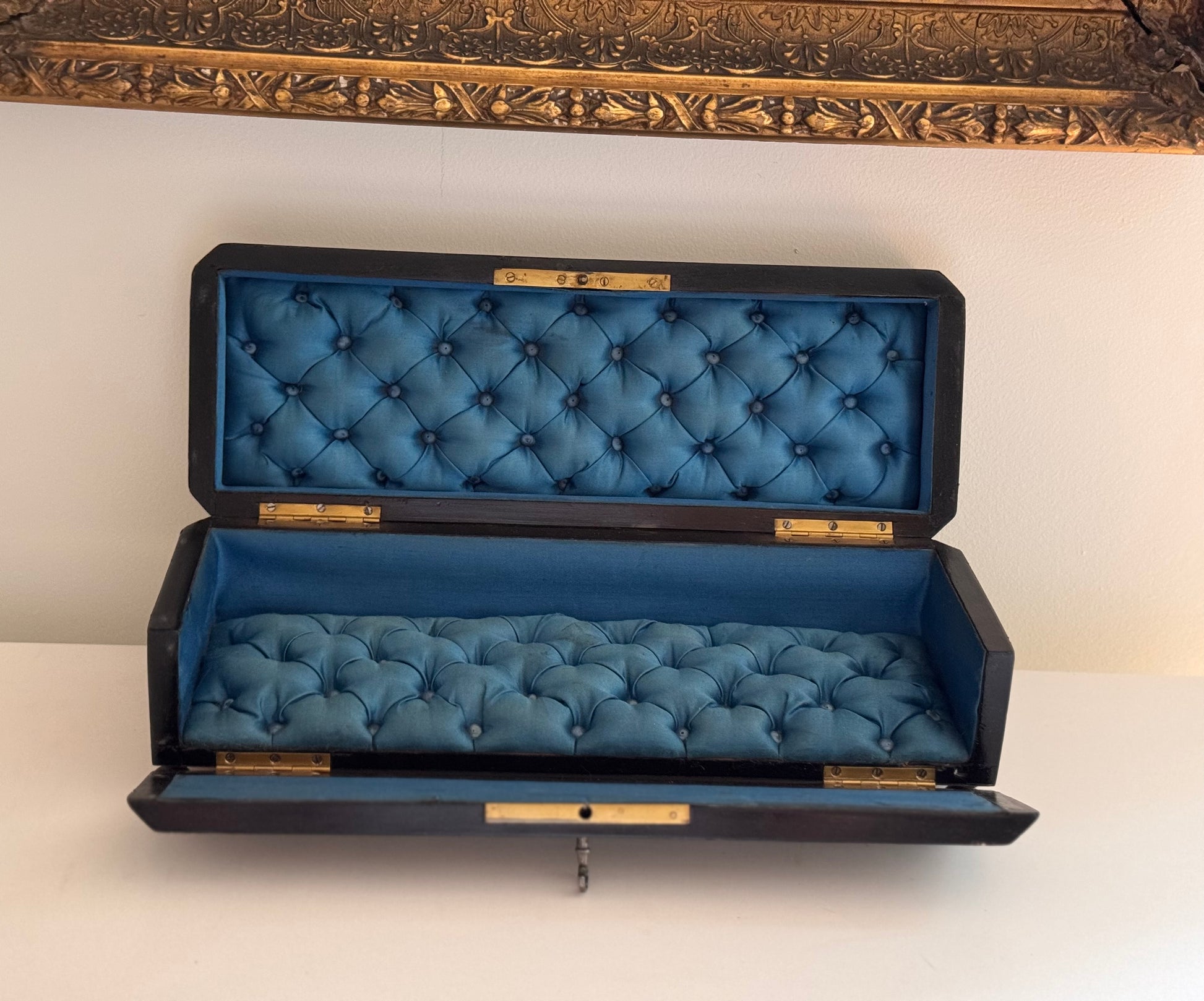 Antique French burl wood marquetry glove box. Original key, gorgeous mother of pearl and brass inlay design, and in fabulous condition blue silk tufted interior! There are two disclaimers - the key works and turns but the locking mechanism is broken so it doesn’t lock. There is also one small piece of brass trim on the back left that is missing. The previous owner camouflaged it with gold paint so it’s hard to tell it’s missing. Otherwise, a perfect box. And just look at those little feet!