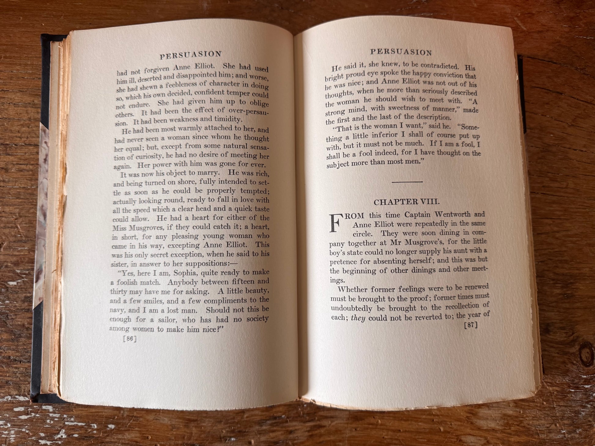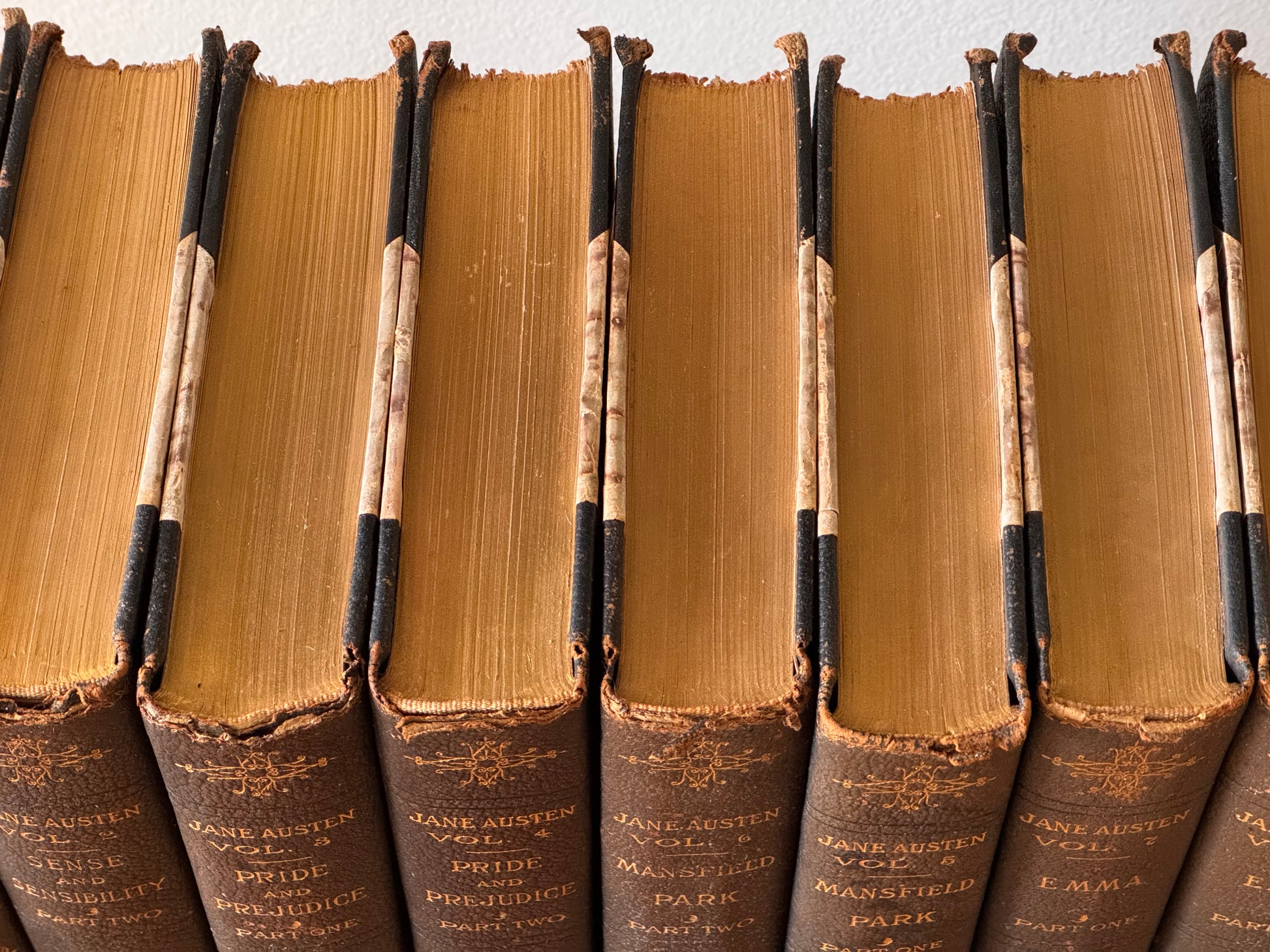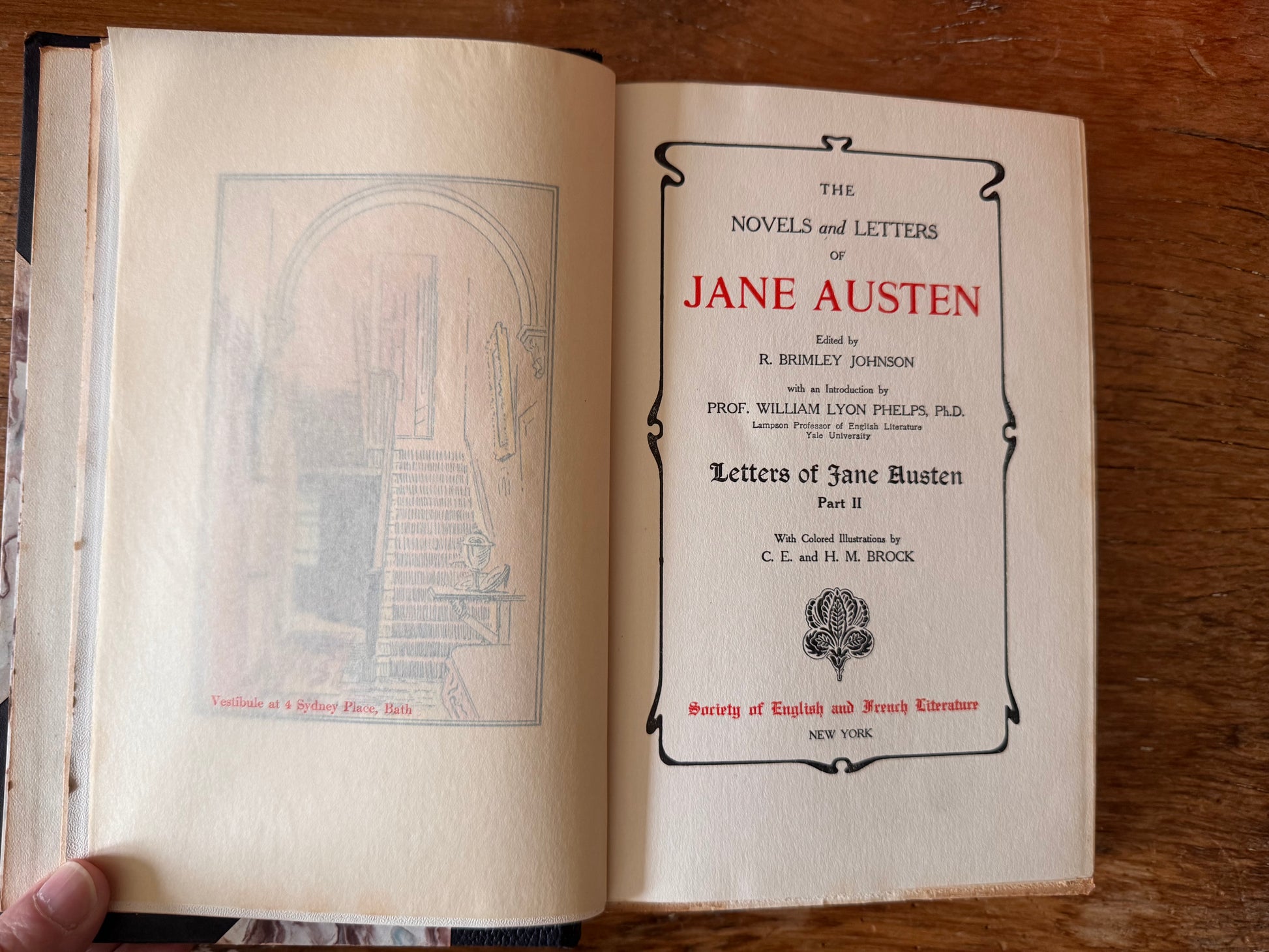 Antique complete set of the Manydown Edition of Jane Austen novels. The Manydown Edition was an American edition of Austen’s collection with different illustrations than were published in the British versions. The American editions were published under place names relating to Miss. Austen’s life — Chawton, Winchester, Manydown. If you’re a hardcore obsessed fan as I am, you may know that she once accepted a proposal from Harris Bigg-Wither, who was the heir to Manydown Park. She turned him down the next day. Can you imagine if she had accepted?! Jane Bigg-Wither - NO!
