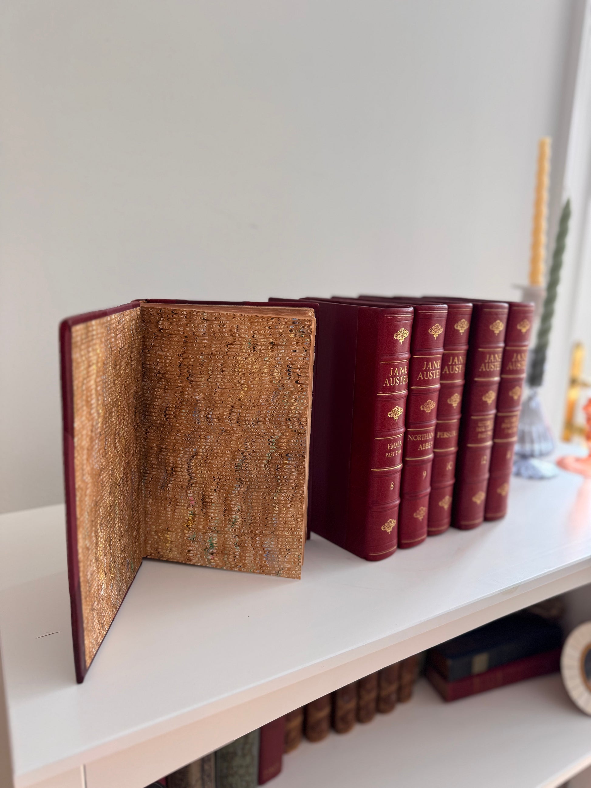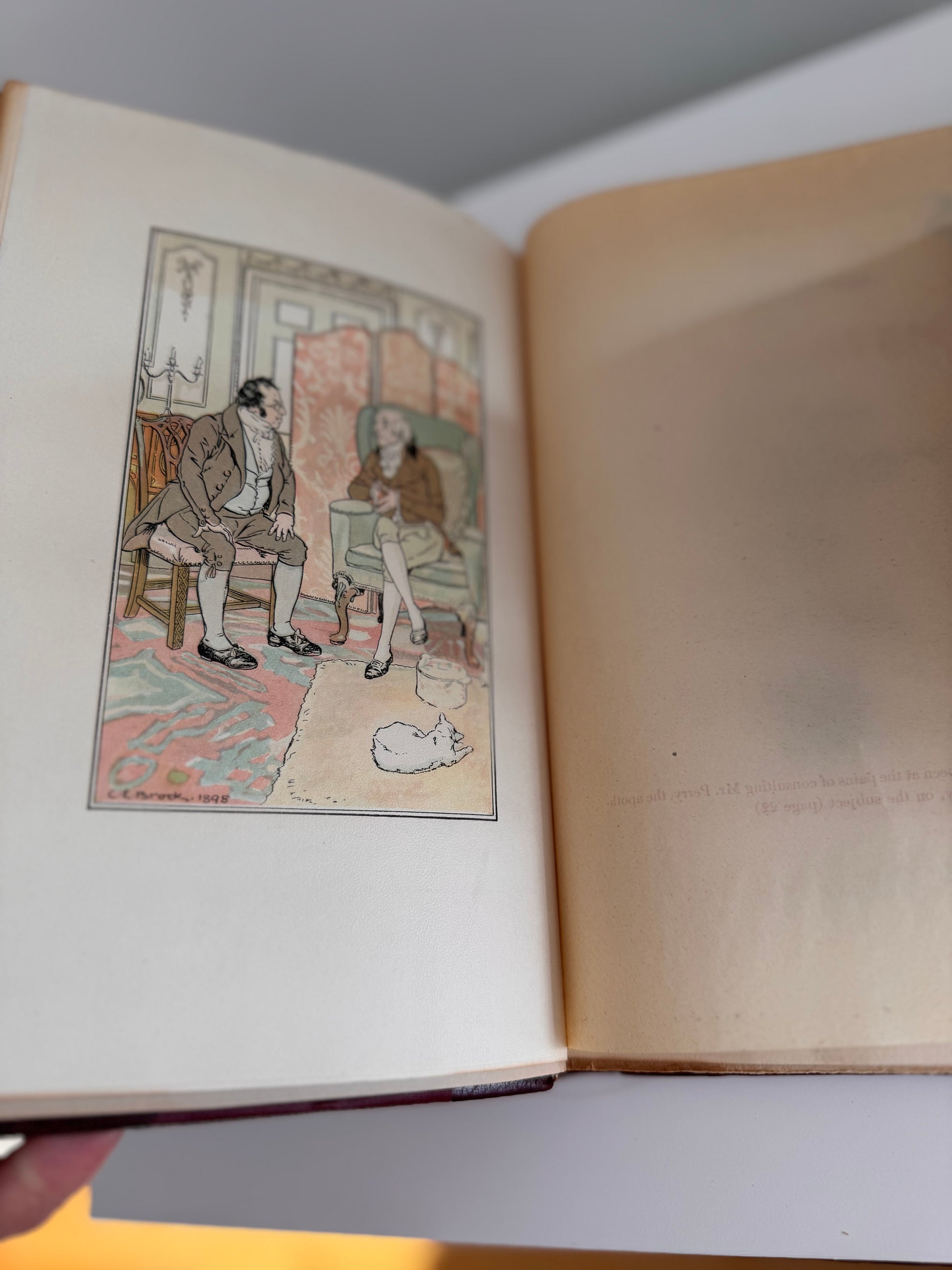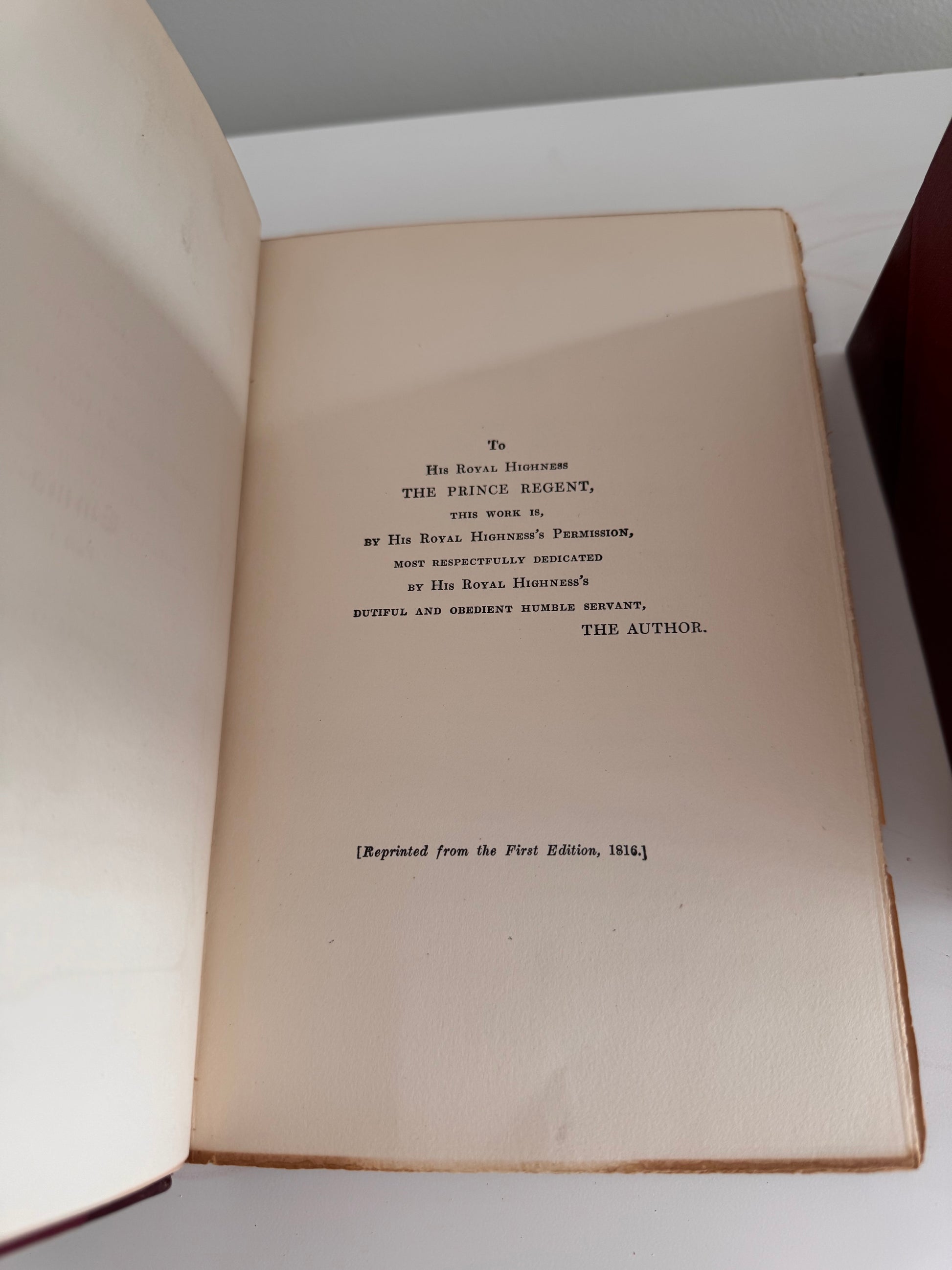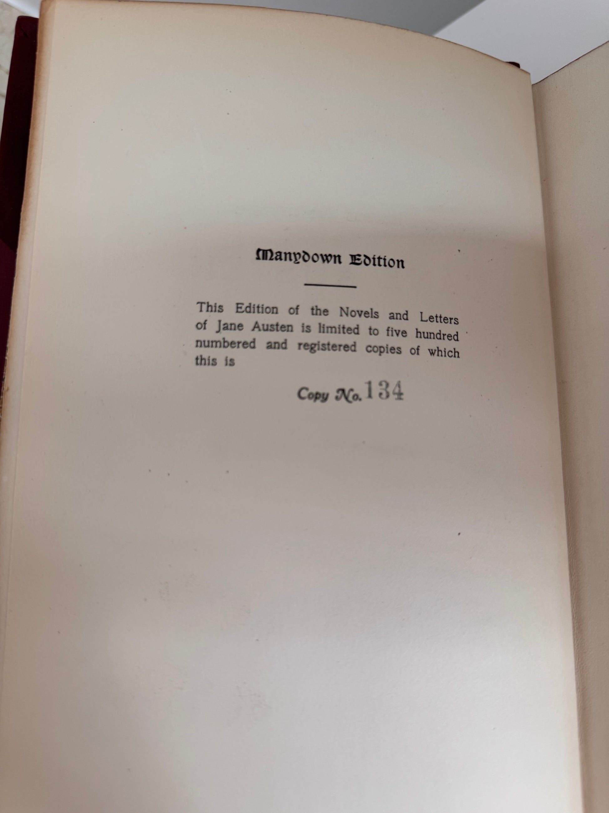 Antique partial set of the Manydown Edition of Jane Austen novels. This was originally a 12 volume set. Here are 6 volumes, numbered 7-12 in Fine condition. The Manydown Edition was an American edition of Austen’s collection with different illustrations than were published in the British versions. The American editions were published under place names relating to Miss. Austen’s life — Chawton, Winchester, Manydown. If you’re a hardcore obsessed fan as I am, you may know that she once accepted a proposal from Harris Bigg-Wither, who was the heir to Manydown Park. She turned him down the next day. Can you imagine if she had accepted?! Jane Bigg-Wither - NO! This is set 134 of 500. No publishing date. Based on the publisher and illustrator, circa 1907. The Manydown edition is the rarest American edition published. Gilded top edge and rough cut fore edge. Quarter leather binding and marbled endpapers.
