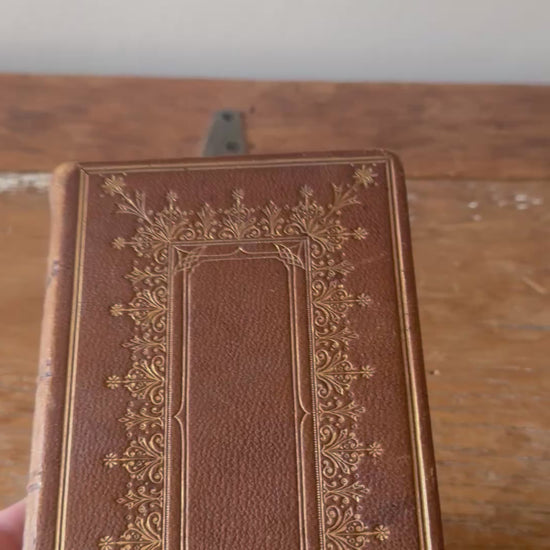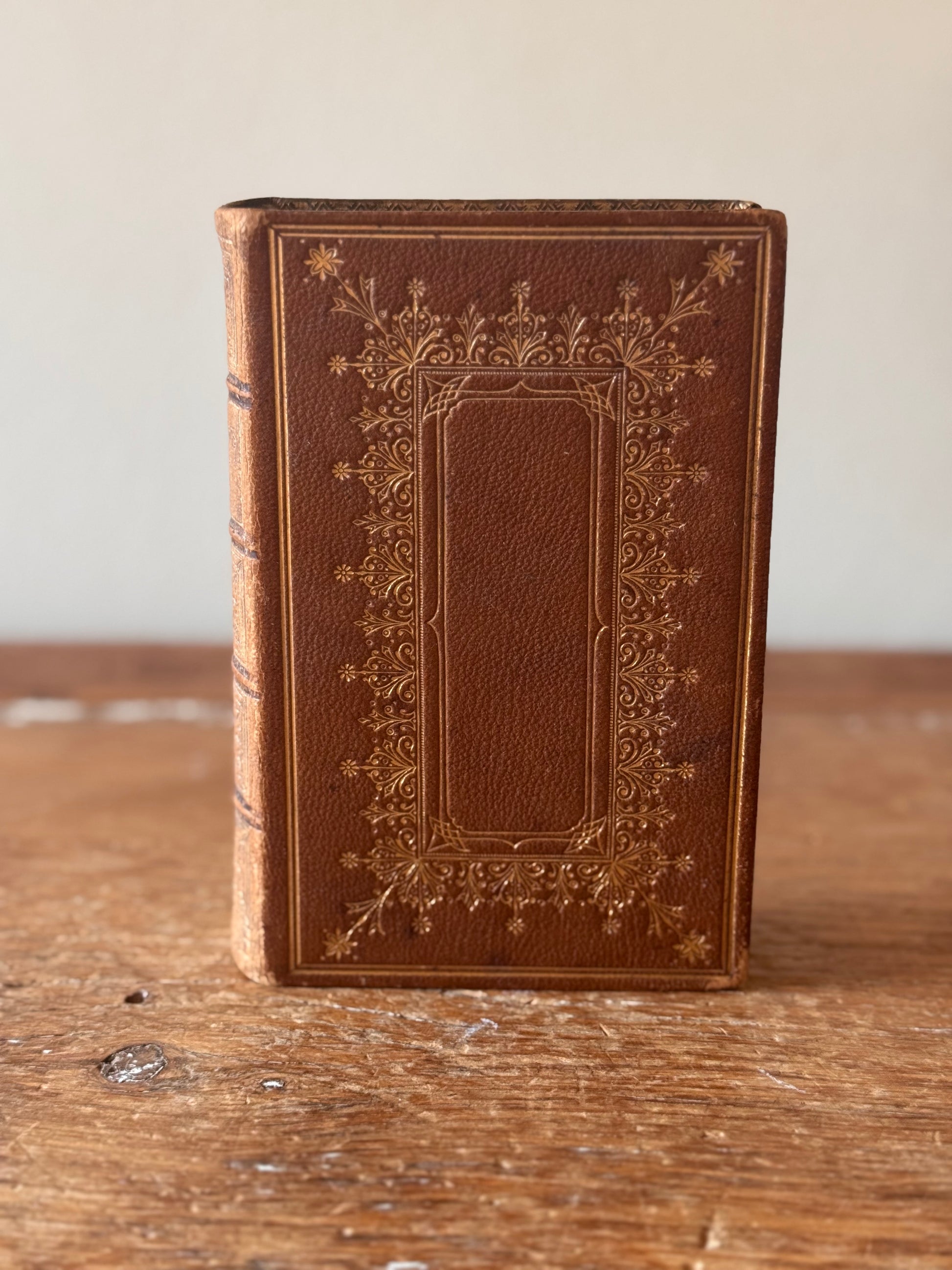 Longfellows Prose Works, full leather blind embossed and gilded floral binding, illustrated and dated 1853. All gilded fore edges with yellow(ish) endpapers, tight binding, no loose pages or cracking splitting to boards. Minor age darkening to pages and intermittent minor foxing. Otherwise a lovely copy!