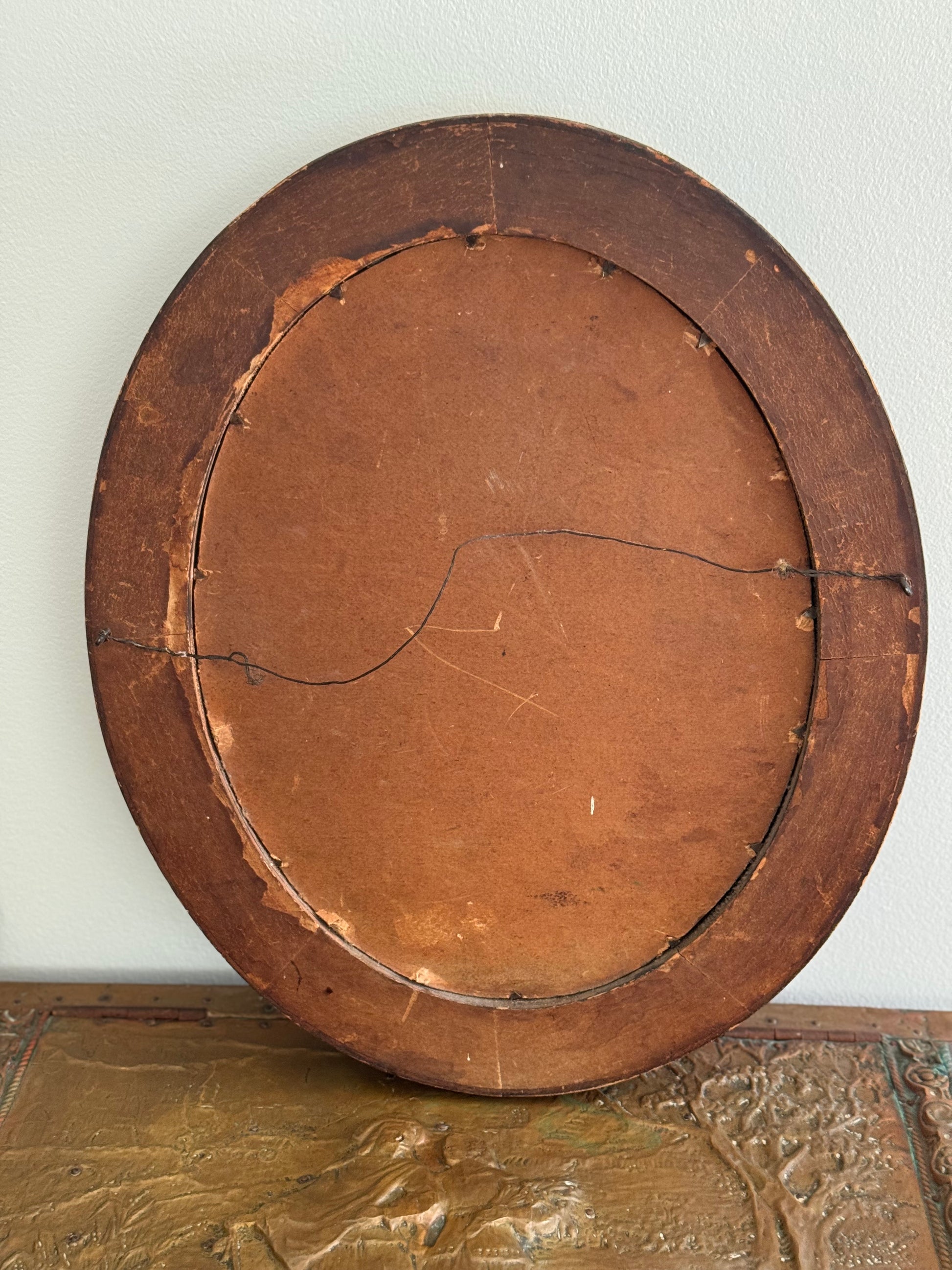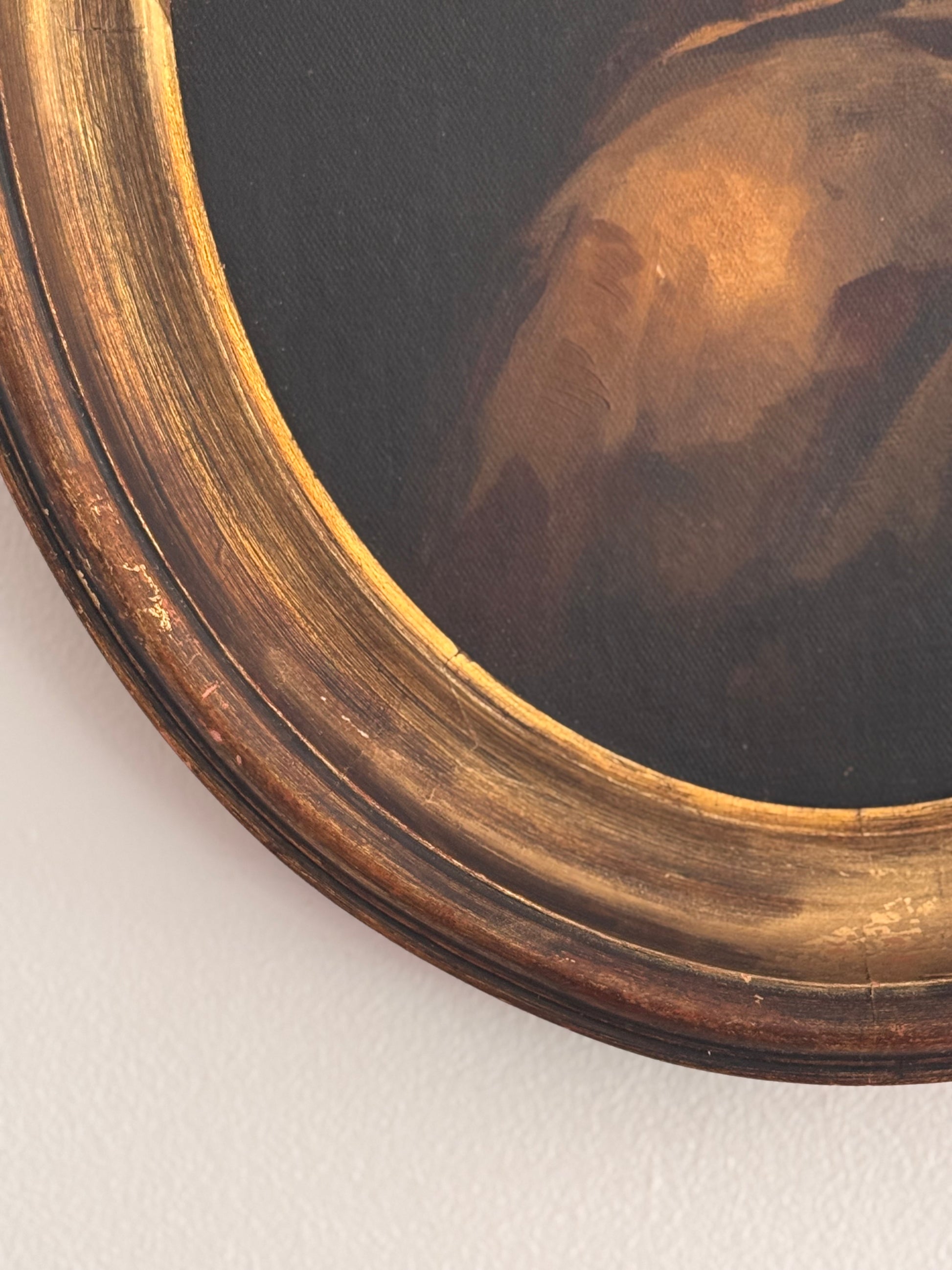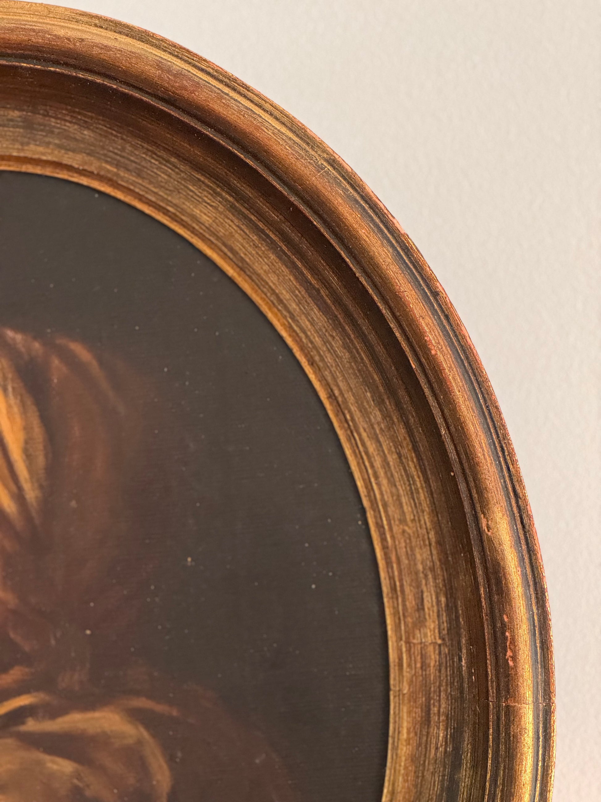 Antique oil on board Italian baroque female portrait painting (unsigned) after Guido Reni. I just love the moodiness of this reproduction! The frame is lovely and chippy and just the perfect size. Ready to hang.
