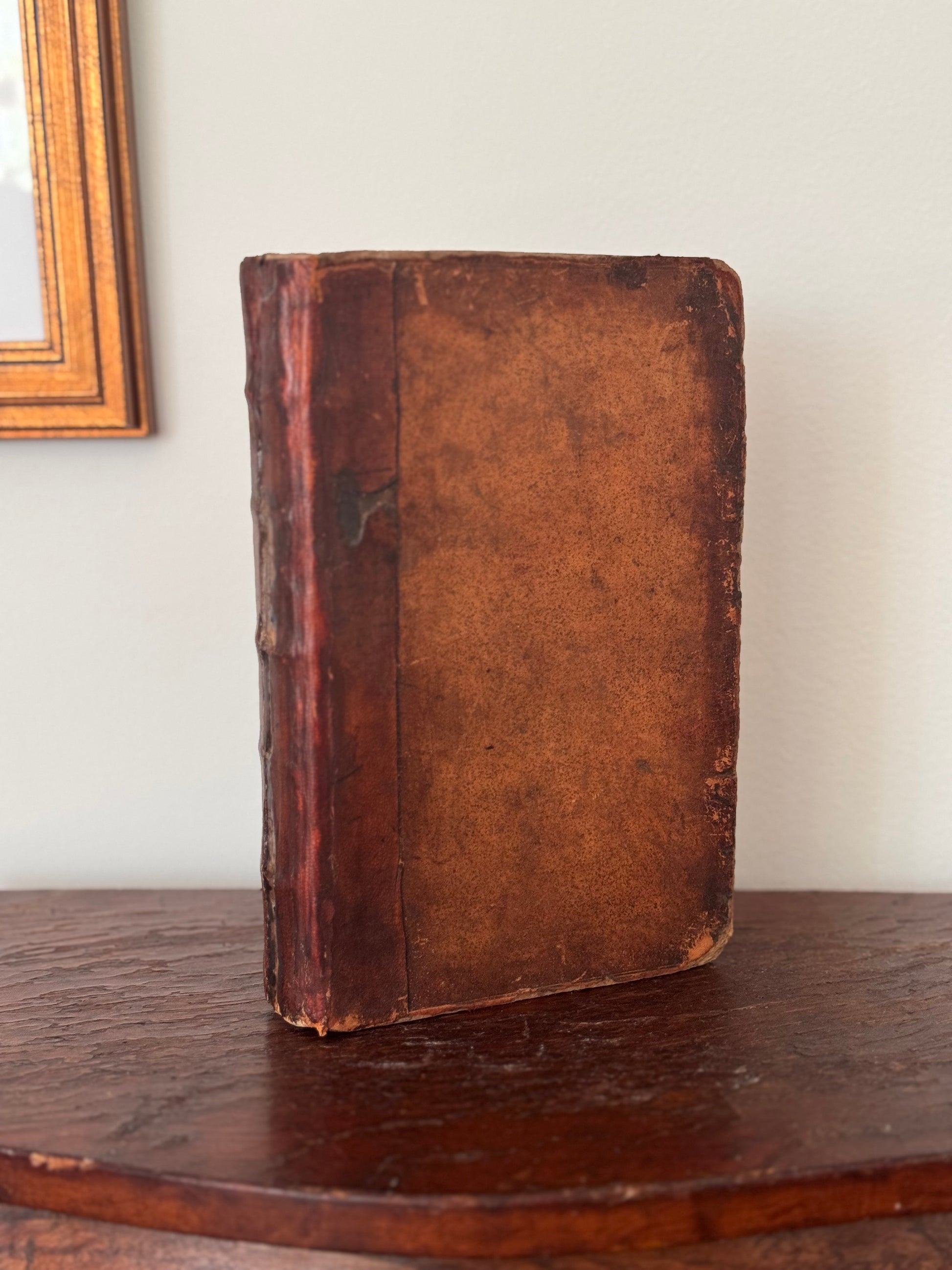Antique mid 18c full leather volume of Three Treatises by James Harris Esq. This is a second edition dated 1765, London. There are three discussed; the first concerning art, the second music, painting, and poetry, and the third happiness. This book is in fair condition but still going strong for its age. Somewhat hard to find second edition - binding is tight with no loose or missing pages. The frontispiece illustration is gorgeous! The spine split at some point and was glued back. Foxing and age darkening to pages with some pages being fragile. Those are mostly the first few pages of the book. The interior pages are fine with no brittleness.