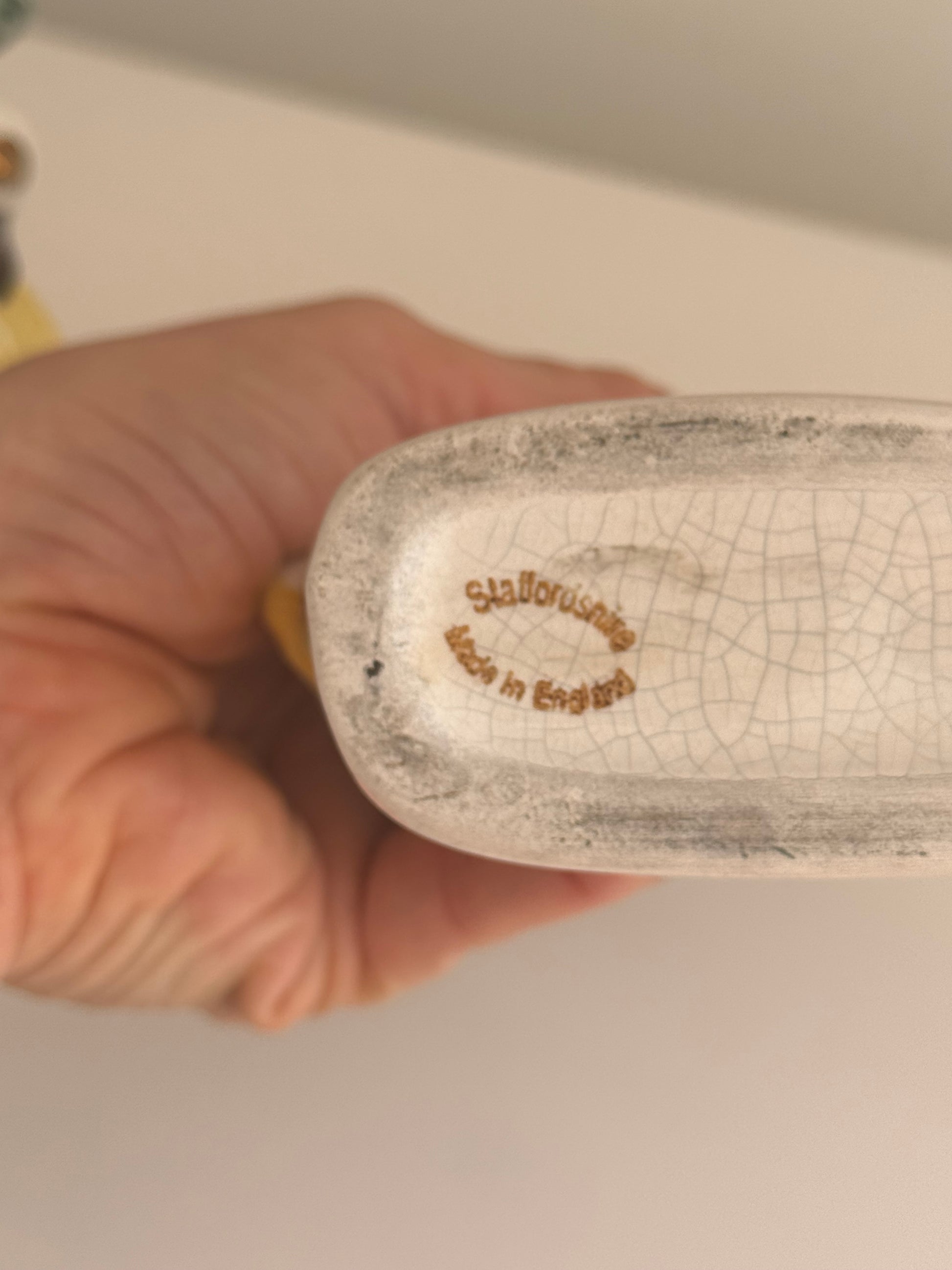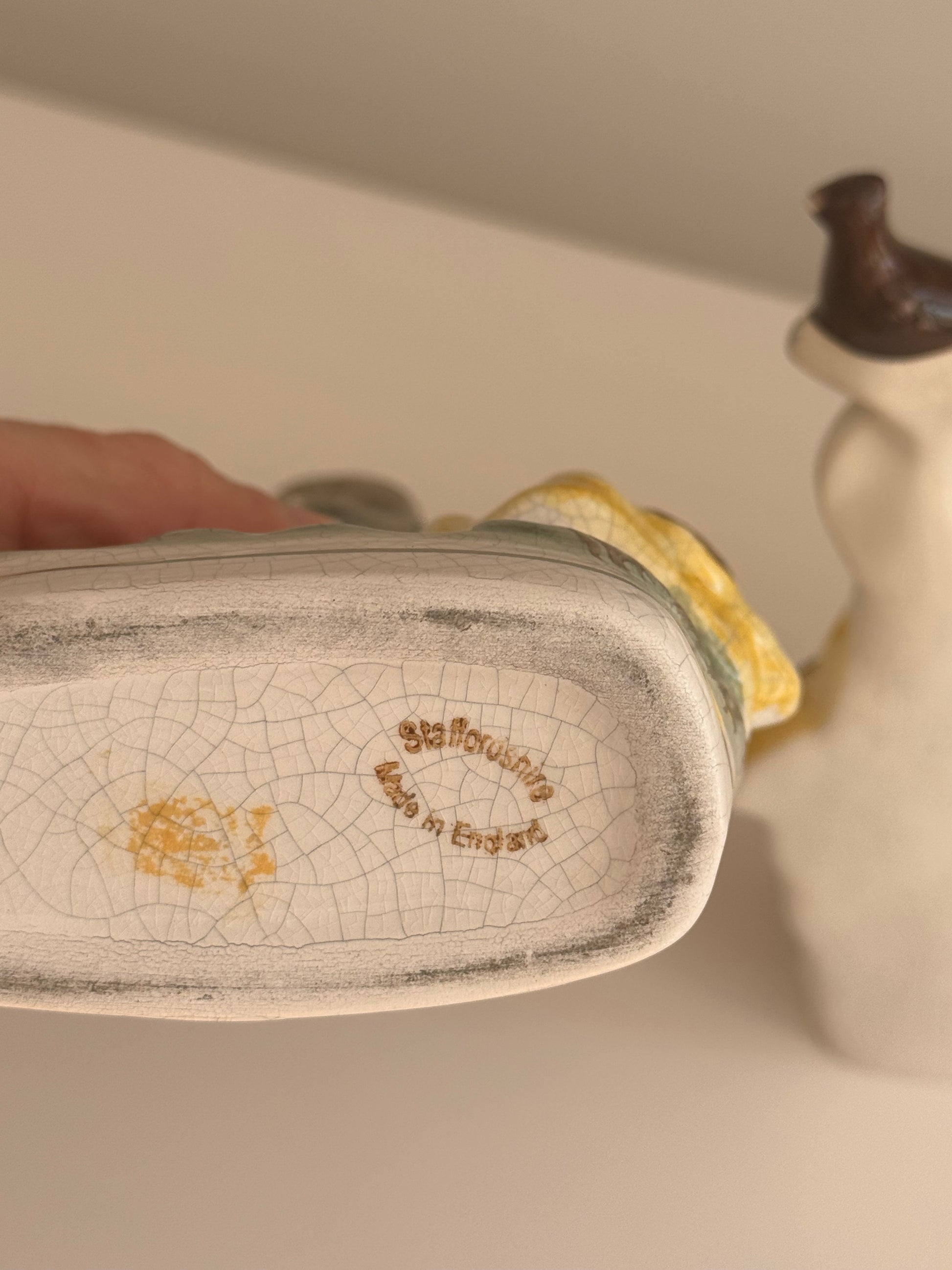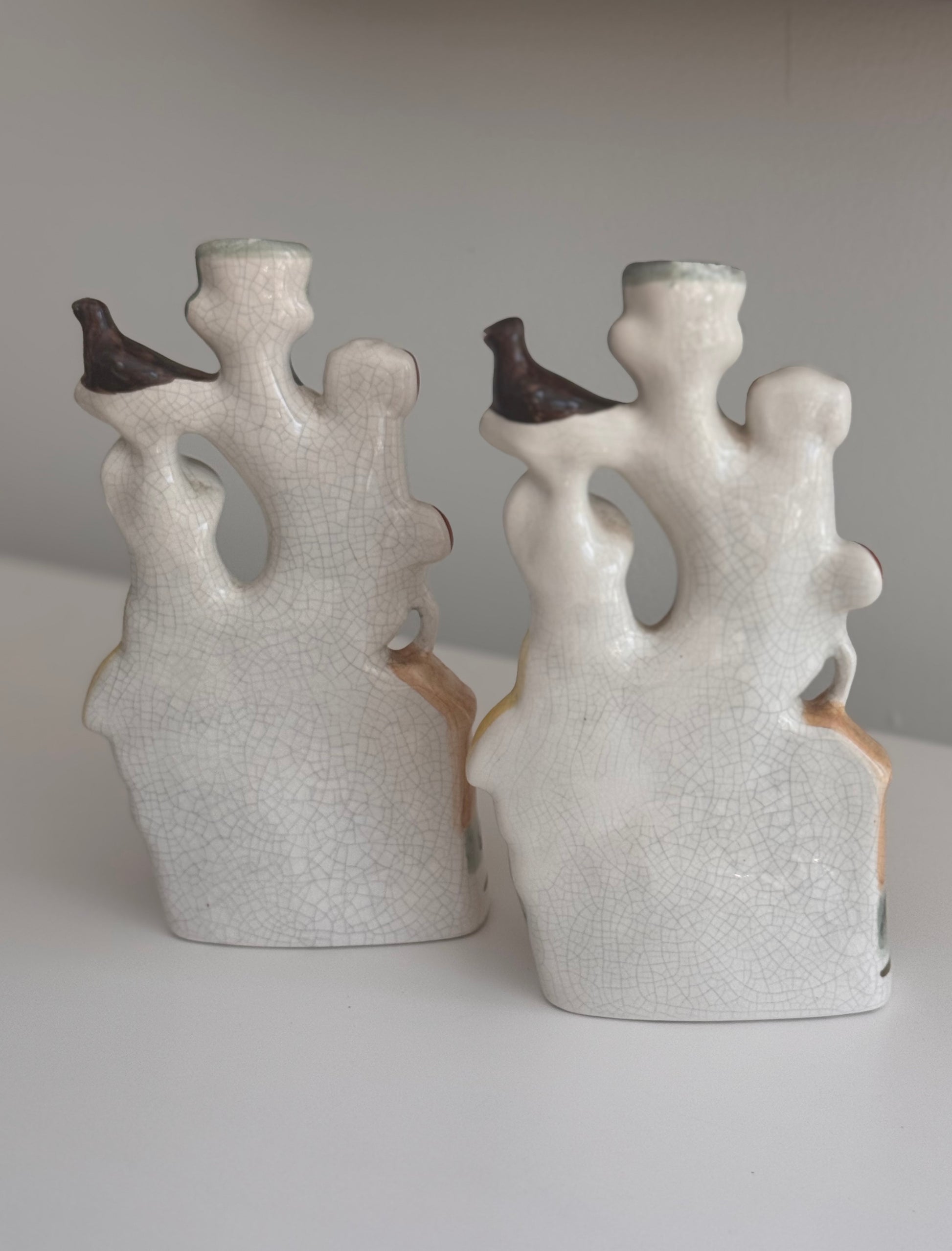 A beautiful stamped antique Staffordshire spill vase of a woman sitting on a tree stump with a staffy dog. No chips or cracks but fantastic crazing.
