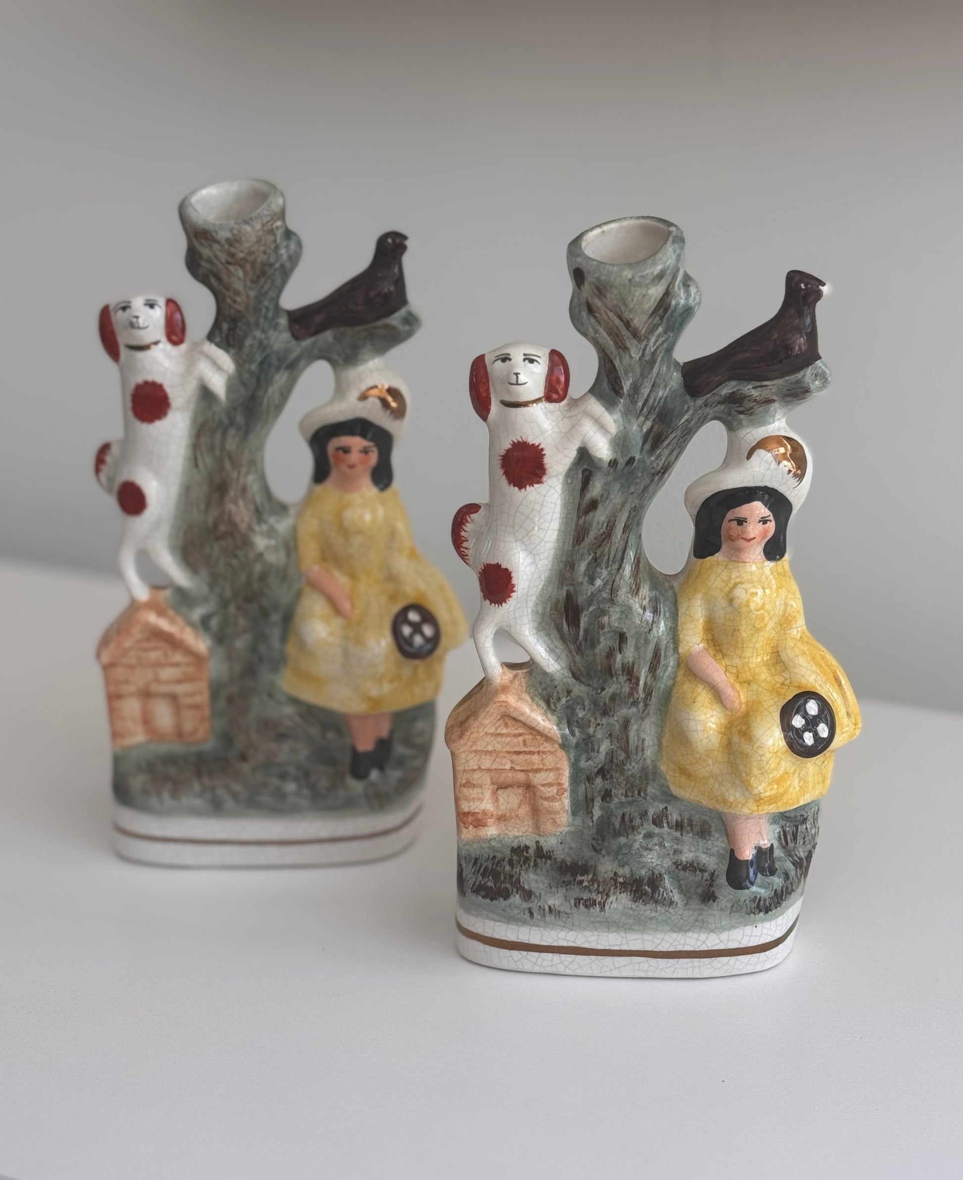 Antique Stamped Staffordshire English Spill Vase Woman on Tree Stump with Staffy Dog