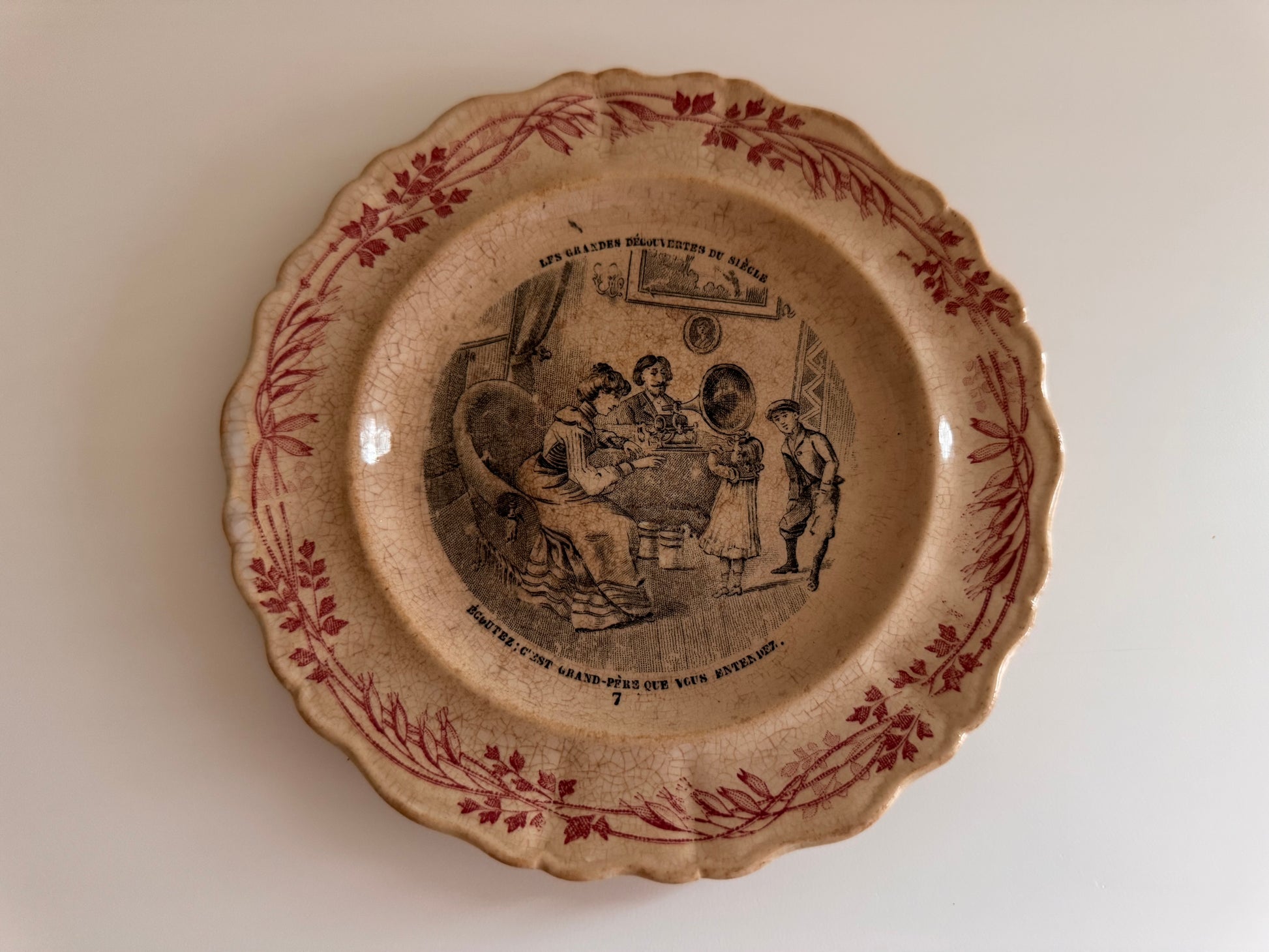3 Antique French Creil et Montereau decorative small plates. Dating to the late 1890’s (based on makers mark) these small plates tell a story called assiettes parlantes. They illustrate the new technology discovered in the 19th century; silent movies, submarines, and cruise boats.