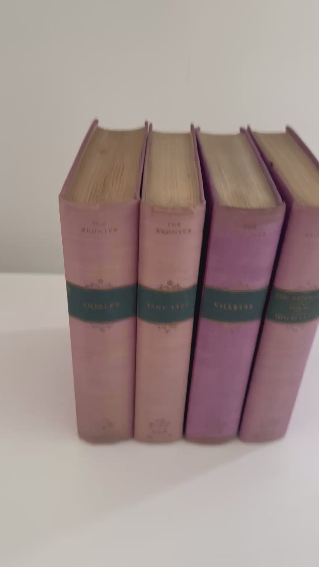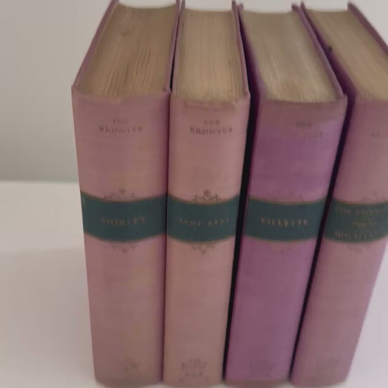 Vintage Charlotte Bronte Heather Edition by Allan Wingate, 1949. Not a complete set - includes Jane Eyre, Shirley, Villette, The Professor/Poems/Miscellanea. Some volumes have sun fading to the spine. All are in good condition - bindings are tight with no loose pages. Interior pages are clean and bright. Overall a good set!
