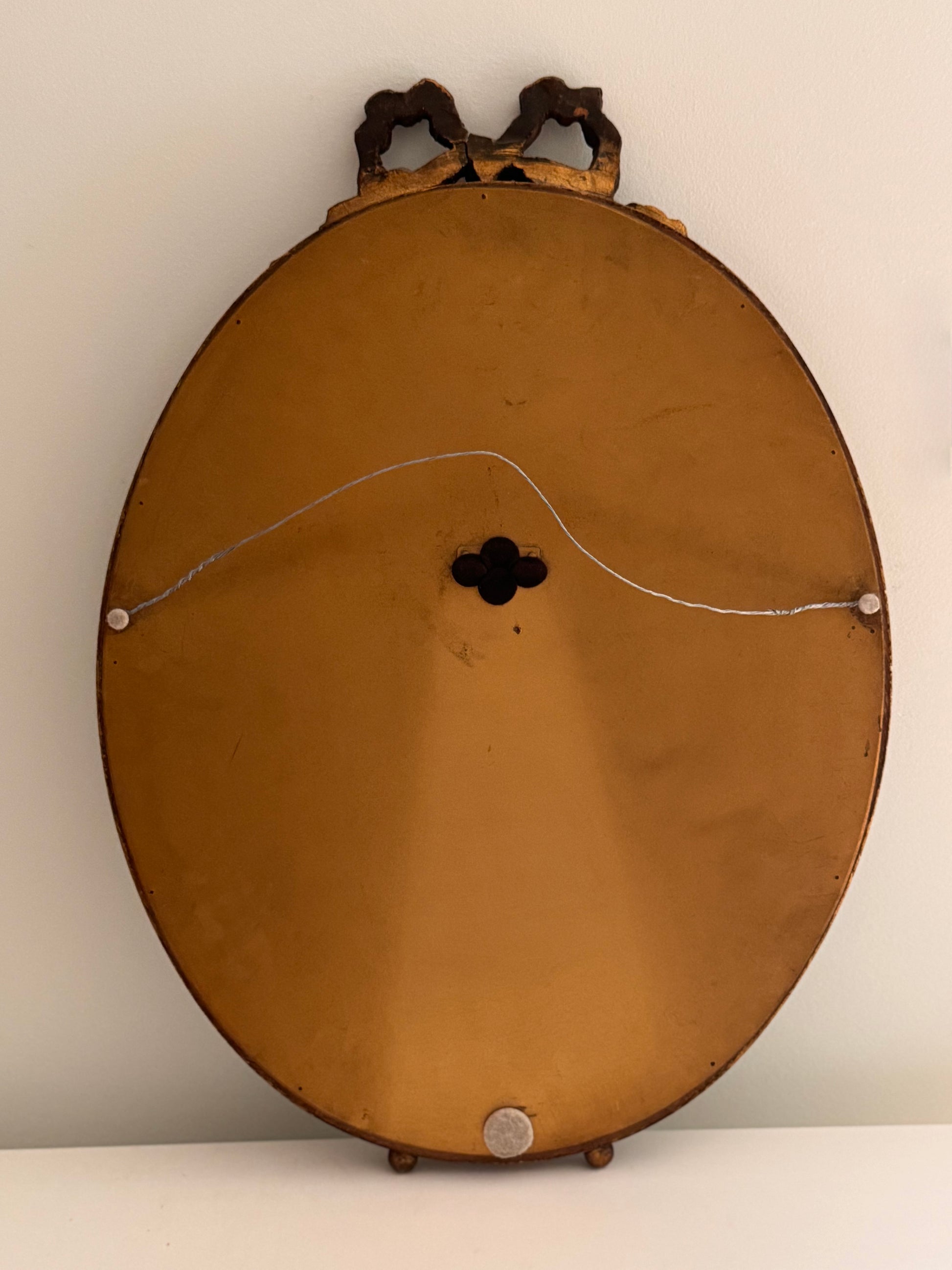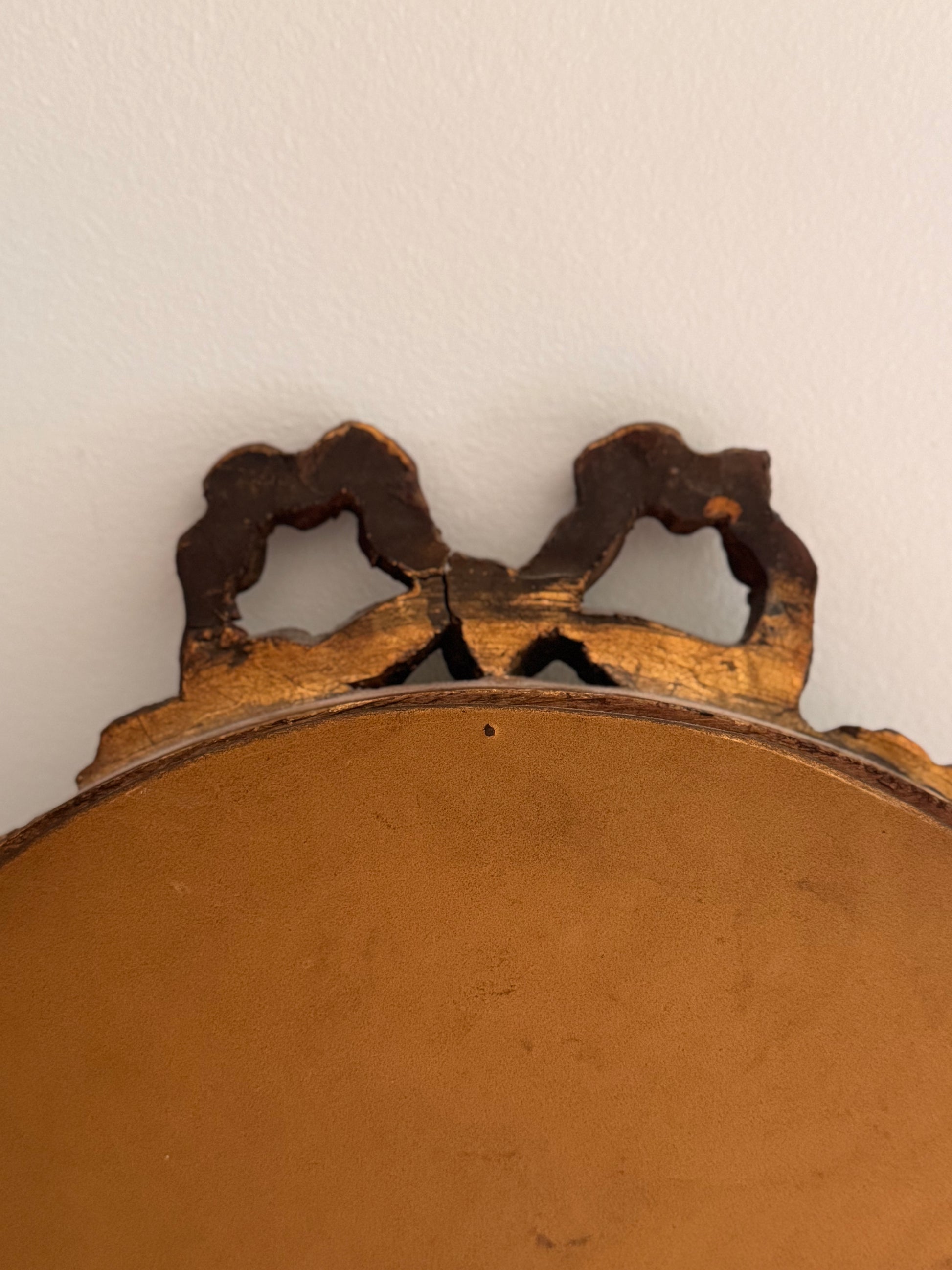 Vintage French Gilded Bow Mirror. I mean, who doesn’t love bows?! Styled just like a bow frame - look at those little feet on the bottom! Procured from an estate that was a wonderland of French furniture. The original owner couldn’t quite remember what market her mother bought it from in France in the mid 1980’s. The frame is wood but the bow looks like plaster. No major disclaimers except some separation happening at the back of the bow (see pic). I will reinforce for shipping. This is a heavy girl at around 10lbs. Super solid and beautiful!