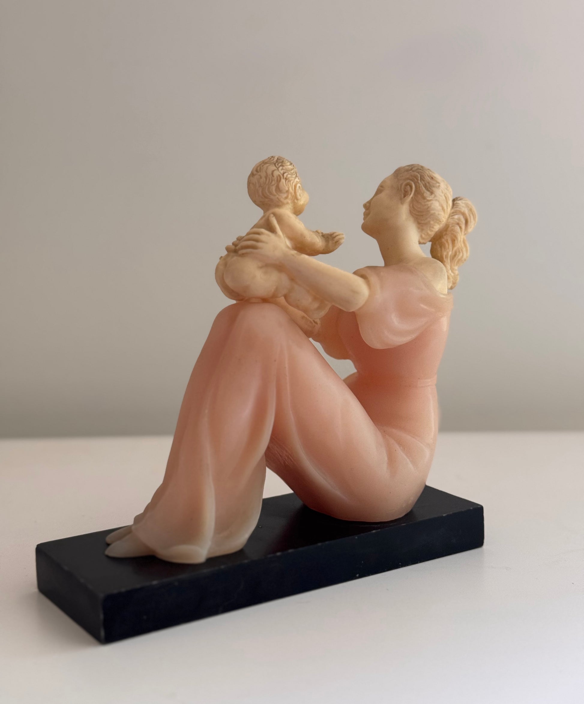 Vintage Italian Bianchi Resin Statue Of Mother & Child Pink Cream Black Figure
