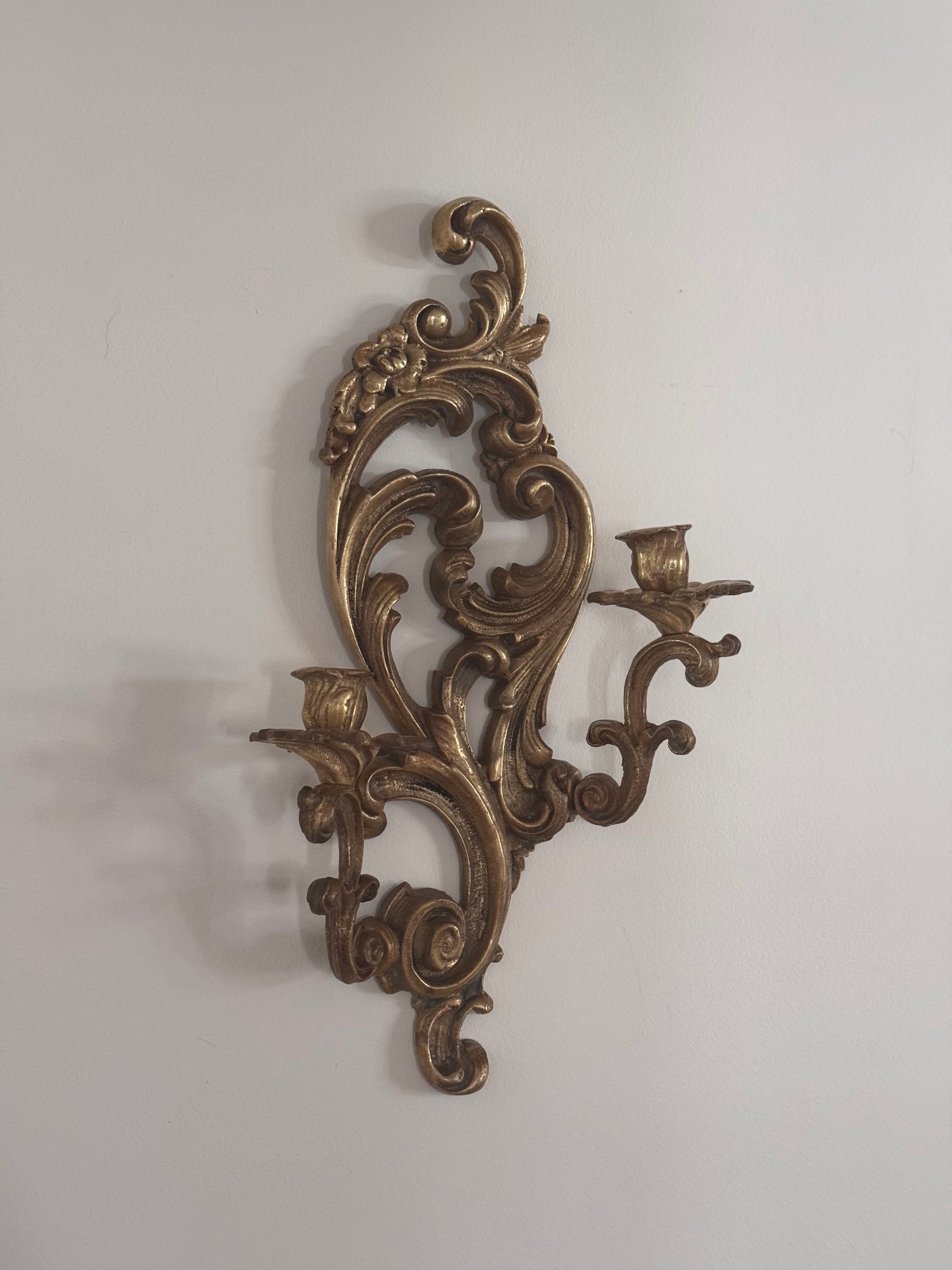 Vintage Solid Brass Baroque French Style Candle Wall Sconce Floral Ornate