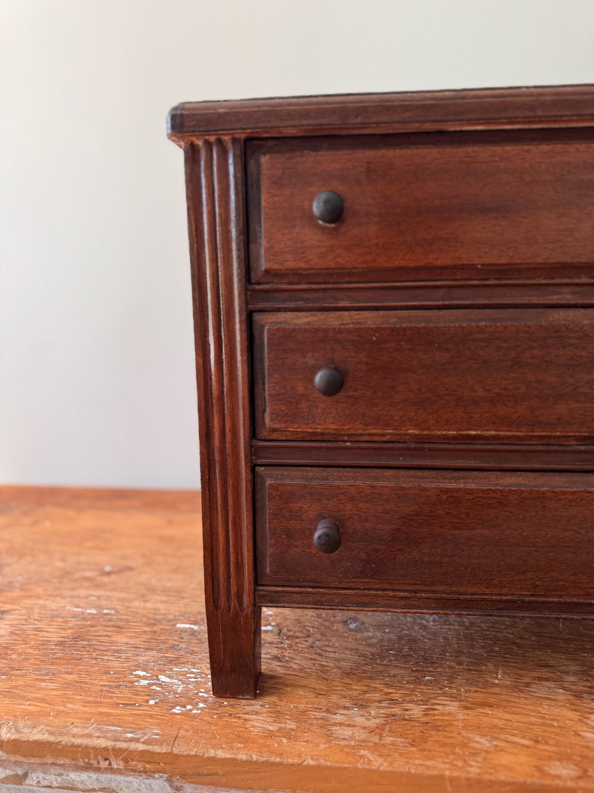Vintage diminutive craftsman style salesman sample dresser. Three working drawers - 2 are the same size and the top drawer is slightly smaller. Normal wear and tear. The only major disclaimer is that it may have had something attached to the top. There are 4 wood putty (?) filled in holes that can be seen from the top. Otherwise just a cute sturdy piece! I couldn’t pass it up. Priced accordingly.